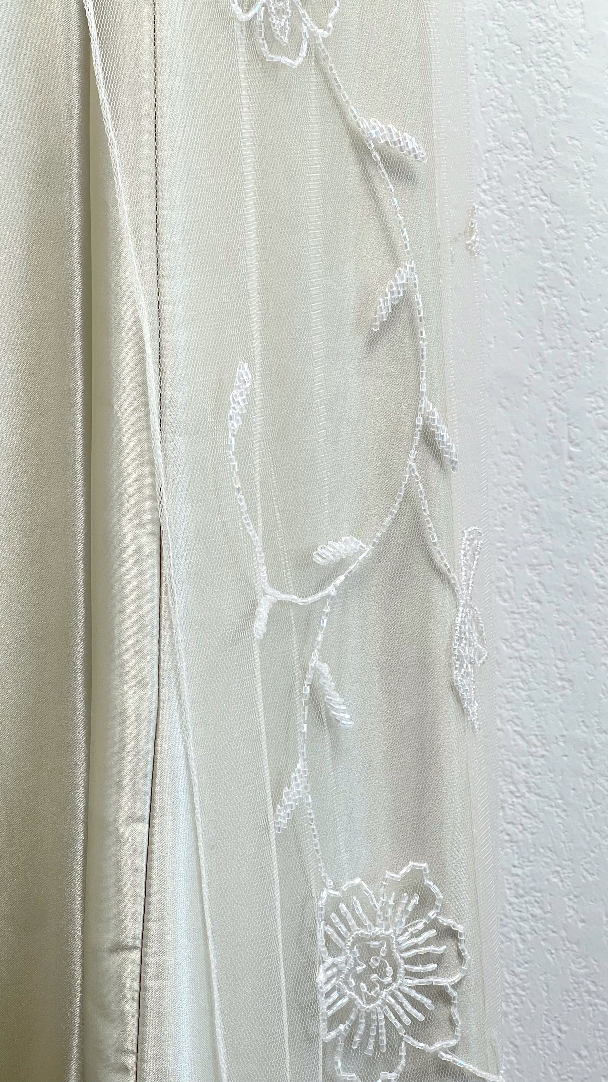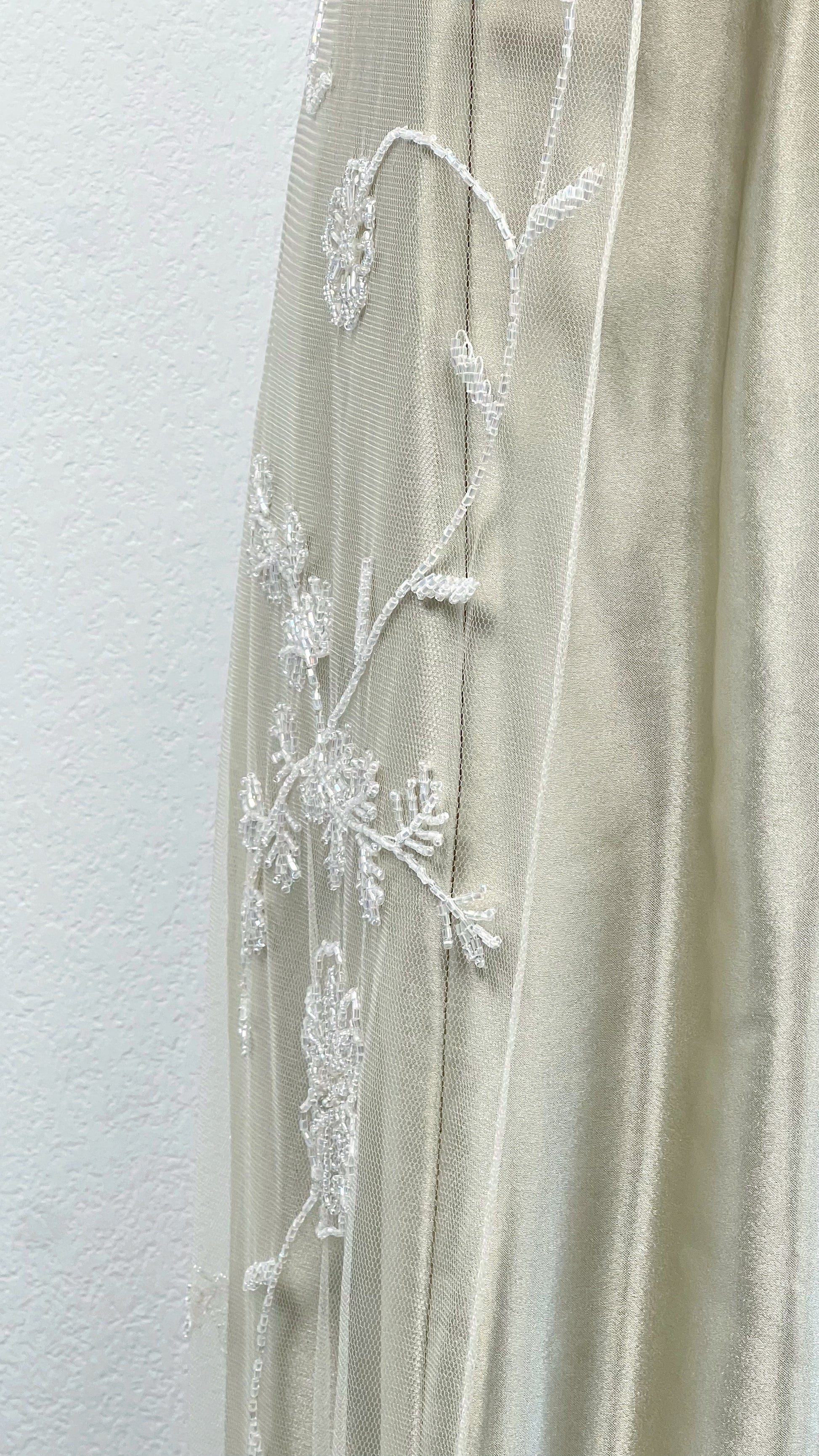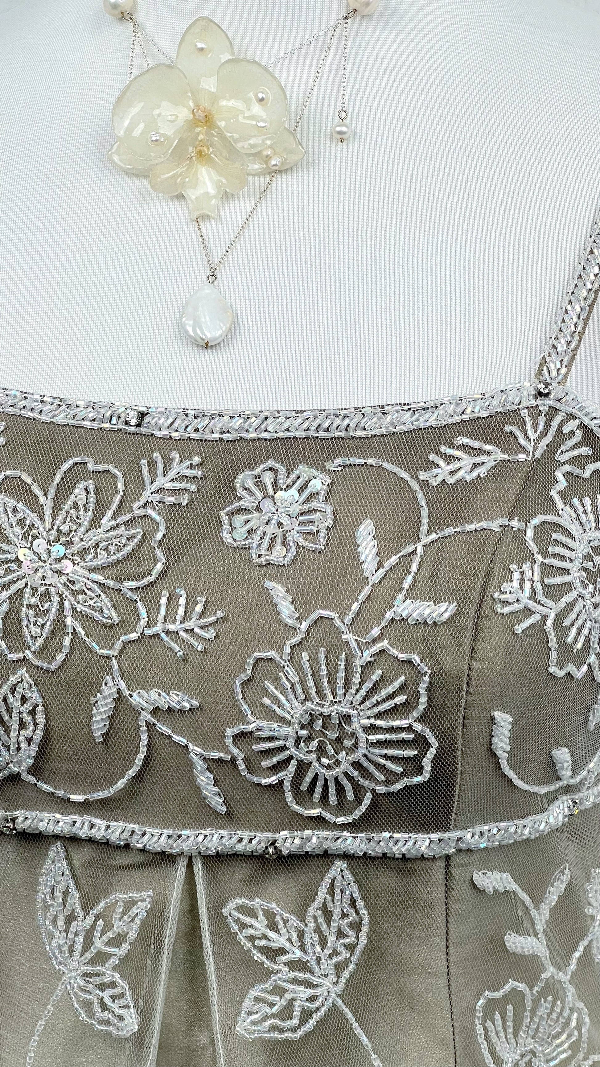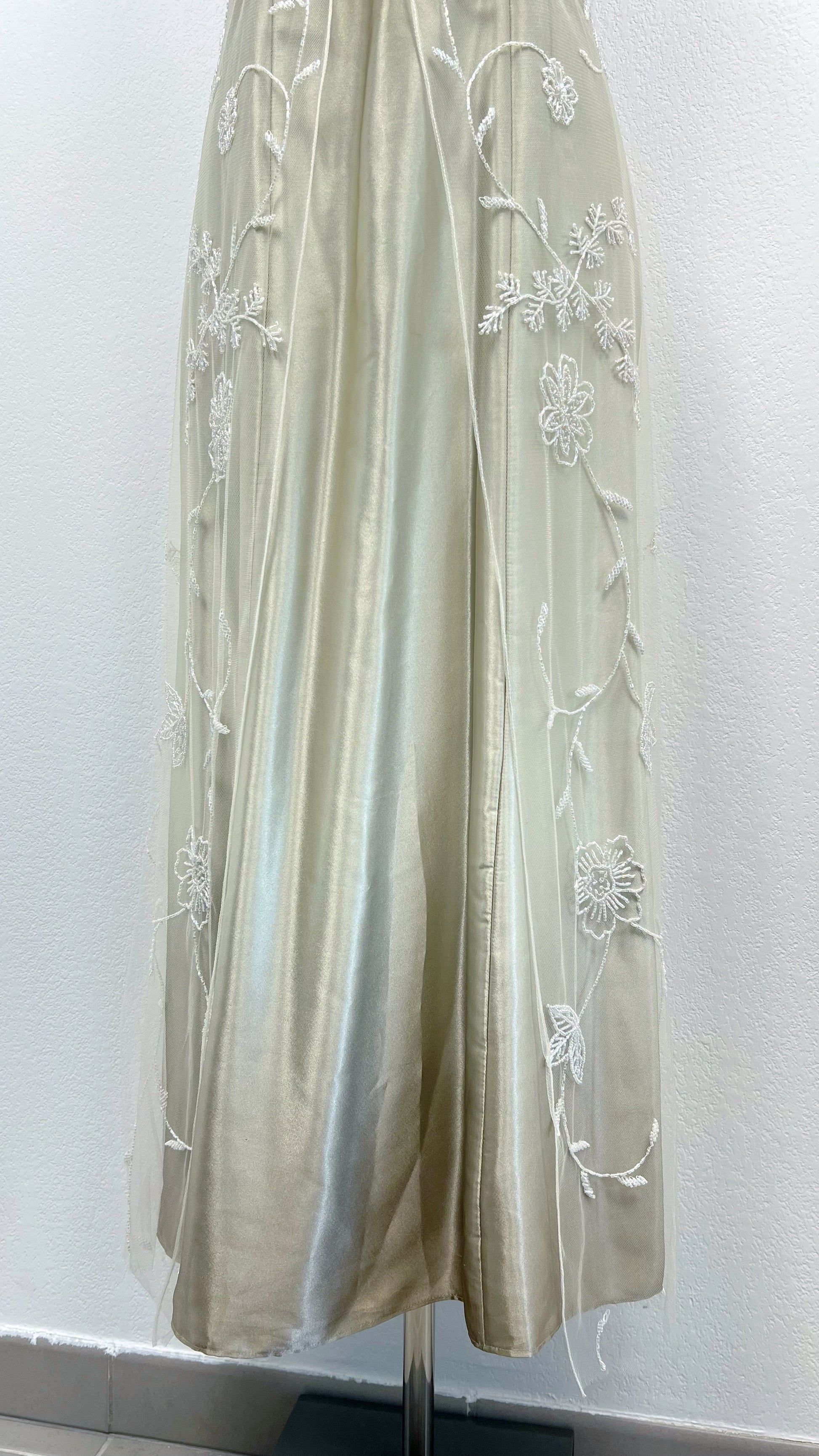 Le corsage finement structuré est orné de broderies florales blanches, tracées comme des lianes délicates sur un voile transparent. Chaque détail semble brodé à la main, donnant à la robe une dimension précieuse et artisanale. La jupe longue, fluide et aérienne, glisse naturellement le long du corps et accompagne chacun des mouvements avec grâce.