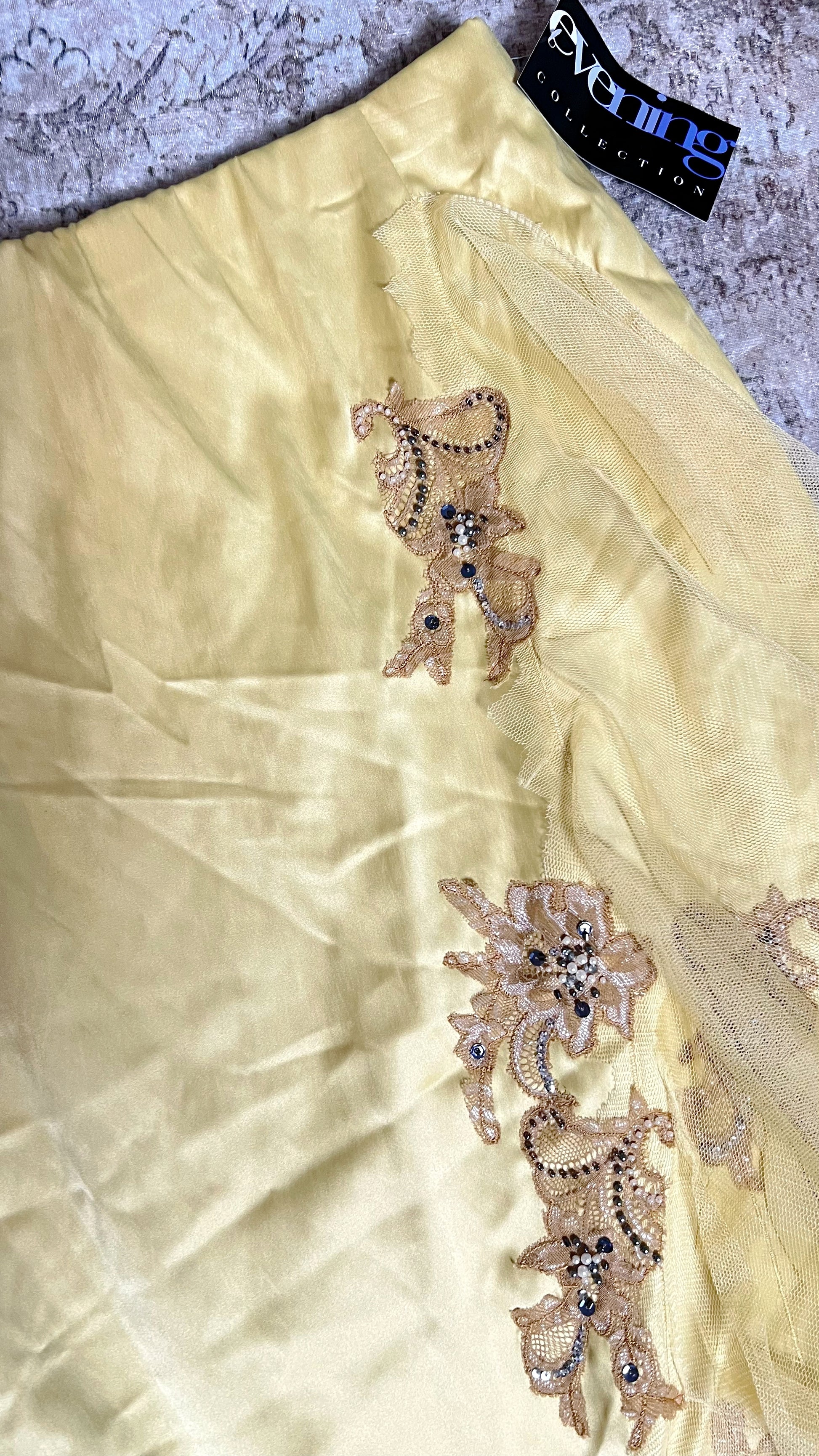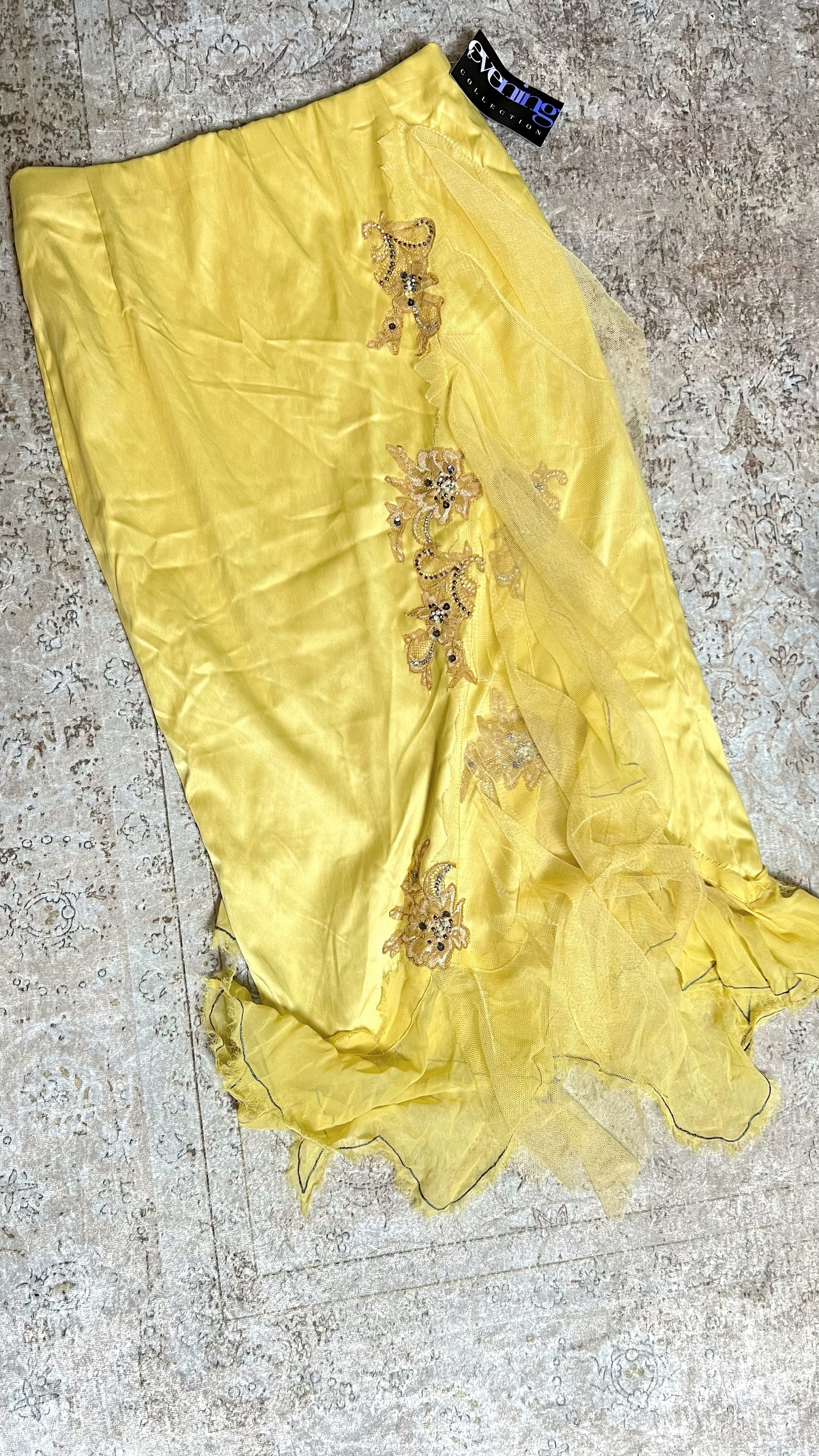 This radiant skirt glows in soft golden yellow, cut in luminous silk satin and finished with a sheer chiffon overlay that floats like morning light. Delicate couture embroidery blooms along the side, scattered with tiny beads that catch the light like dew on petals.