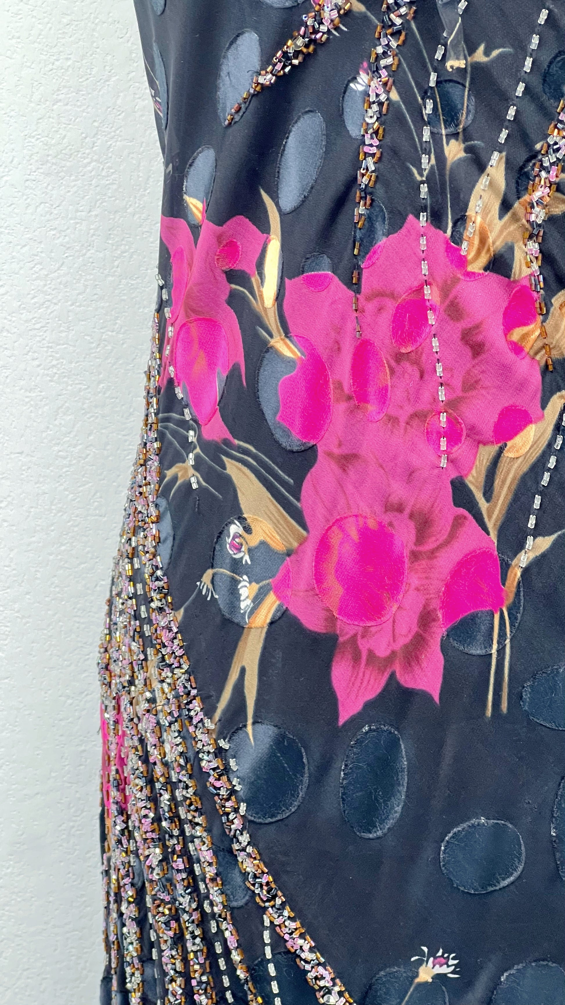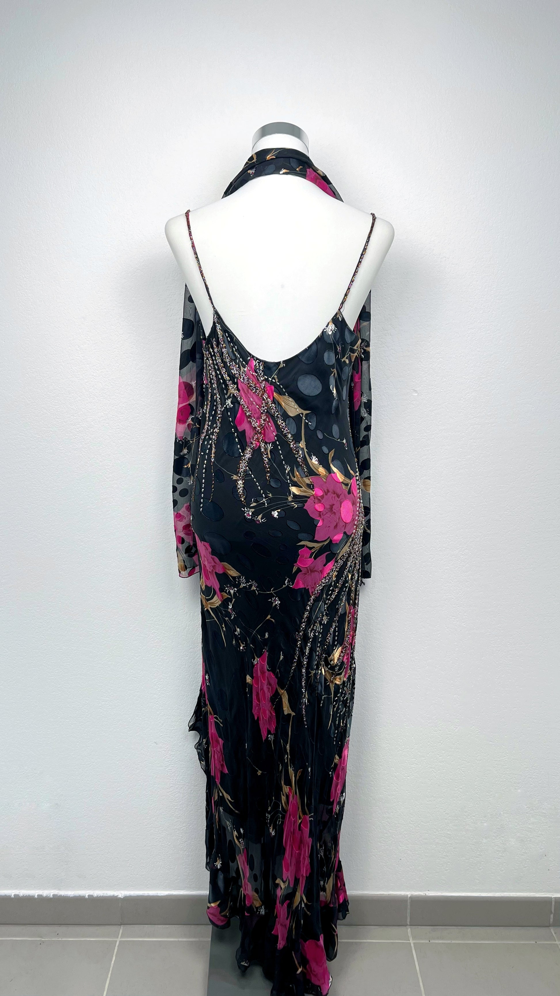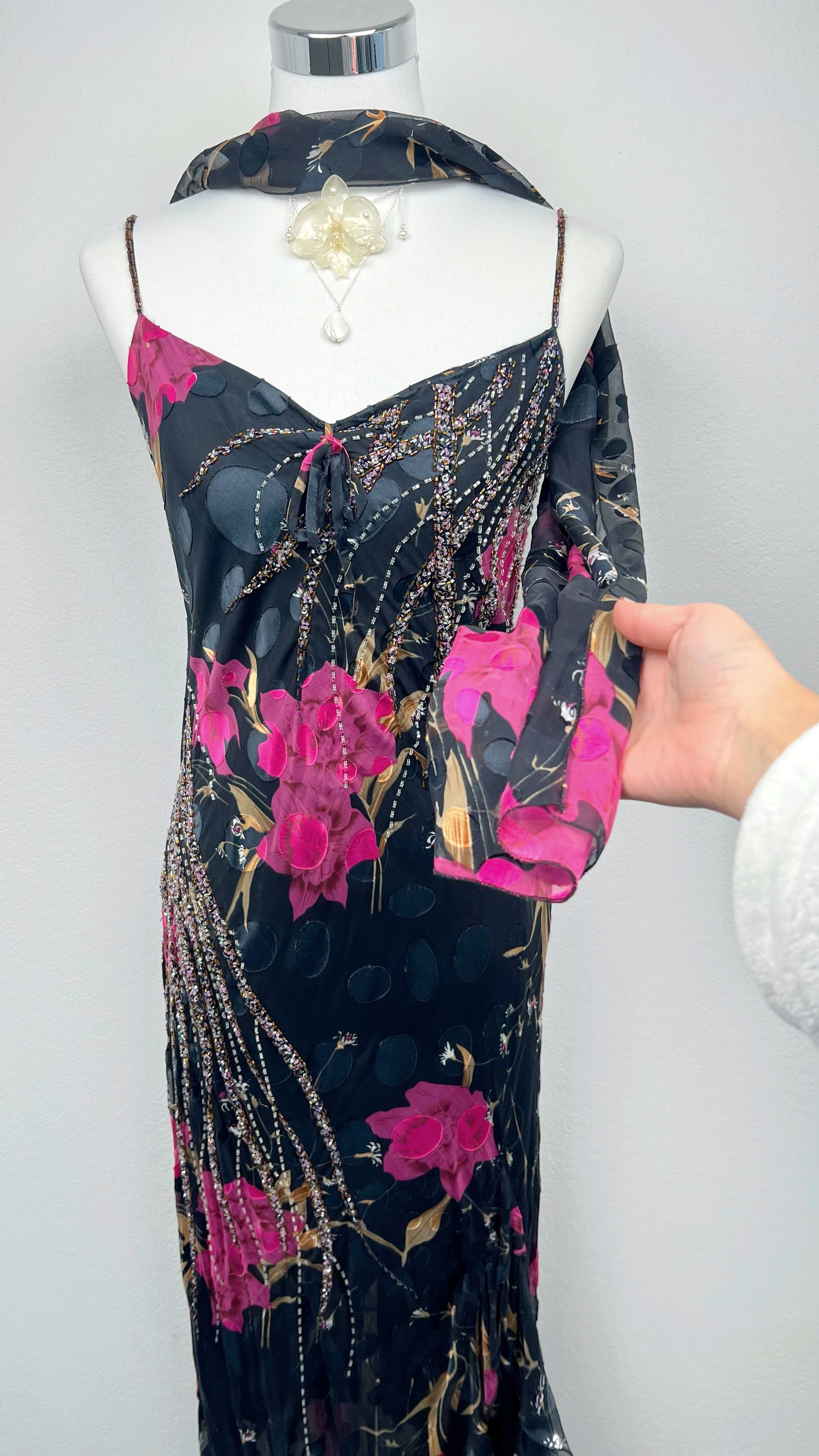 Une robe longue en 100% soie, rare et luxueuse, dans un imprimé orchidées fuchsia sur fond noir minuit. Entièrement perlée à la main, elle offre une silhouette fluide, élégante et envoûtante, parfaite pour celles qui aiment les pièces uniques au charme mystique.