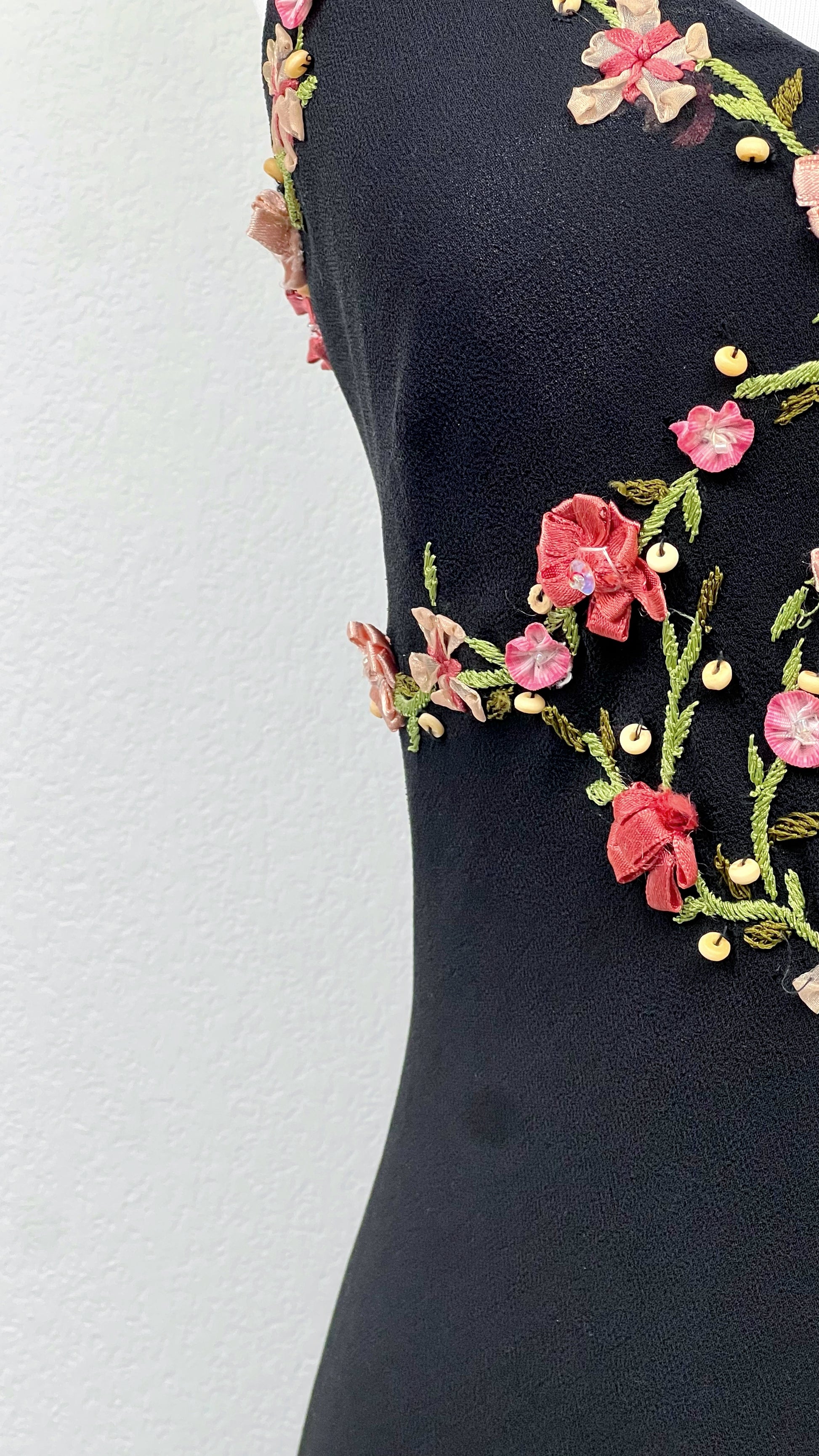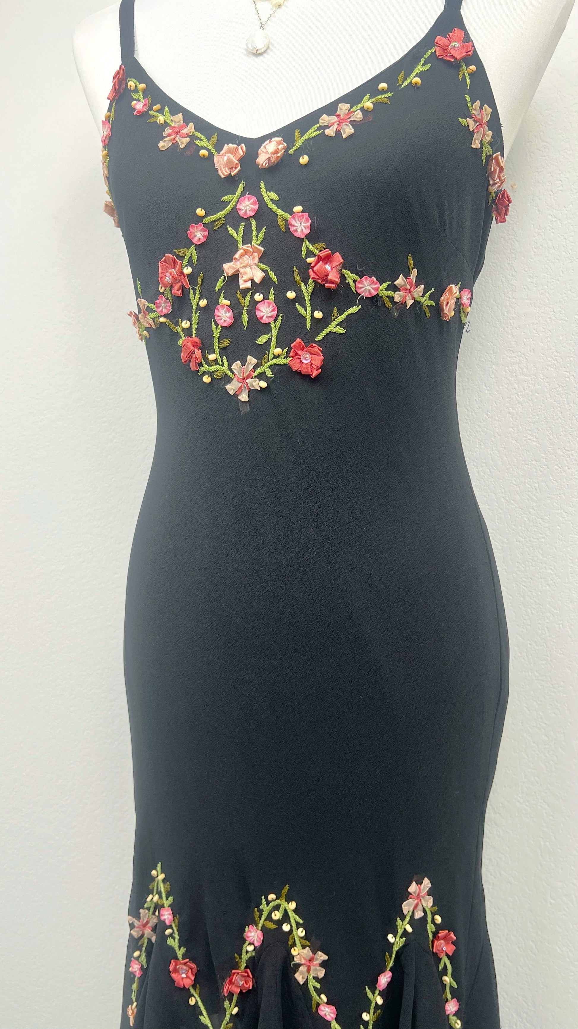 Crafted in fluid silk, the silhouette gently skims the body before unfolding into a soft, handkerchief-style hem that moves with effortless grace. The inky black base creates the perfect canvas for intricate embroidered florals in shades of blush, rose, and muted green, arranged in delicate vine-like patterns across the bodice and hem.