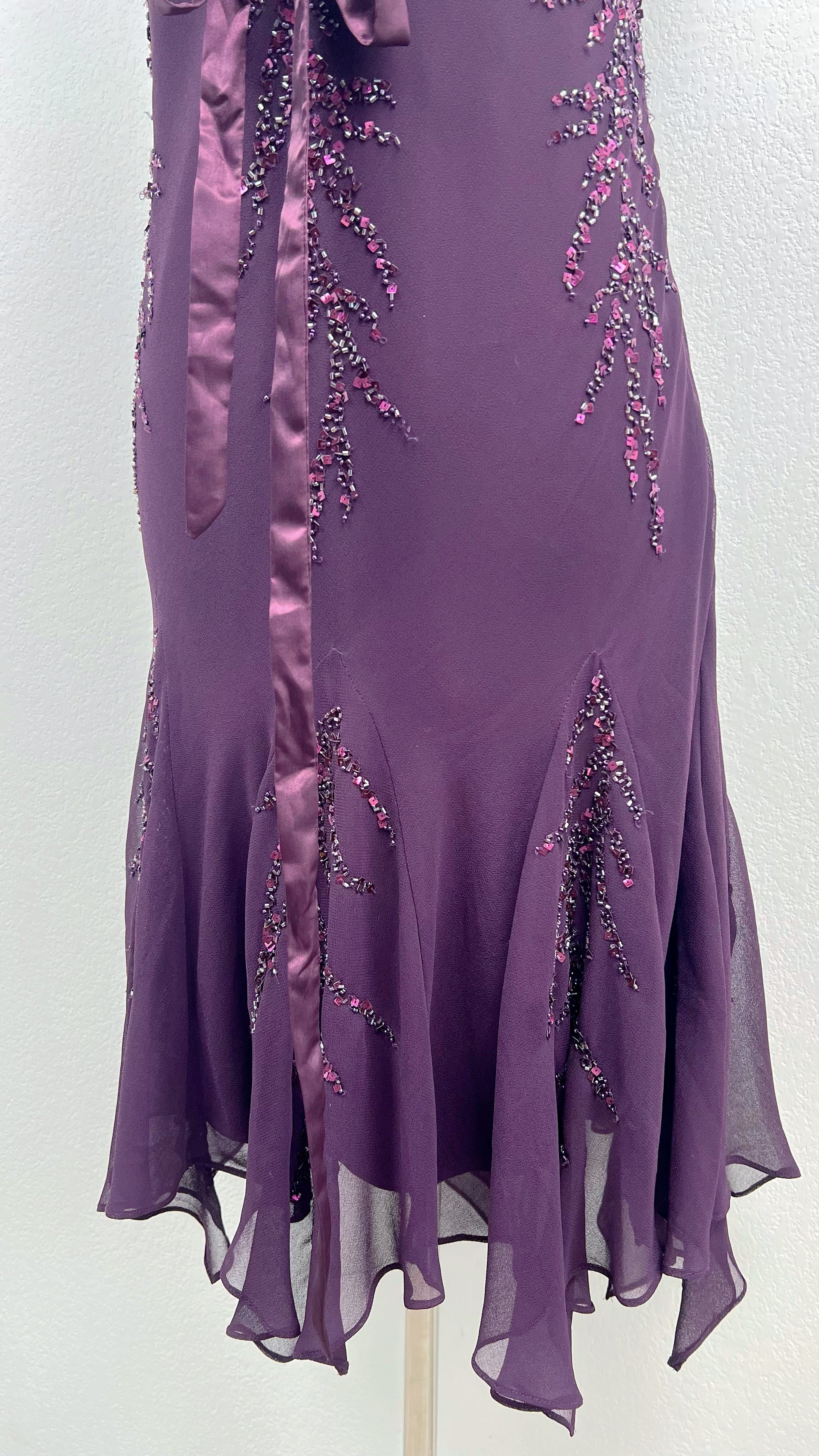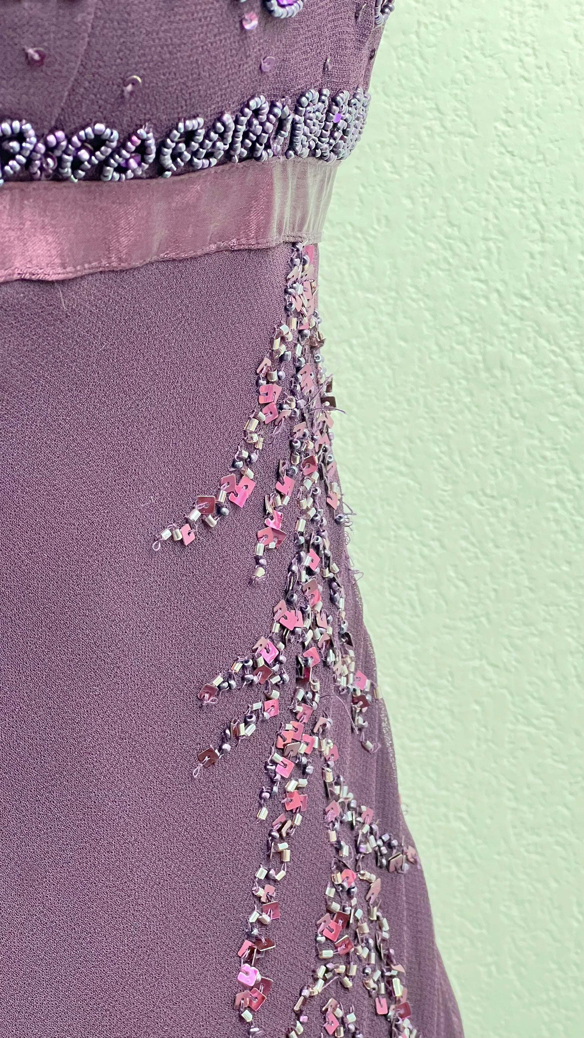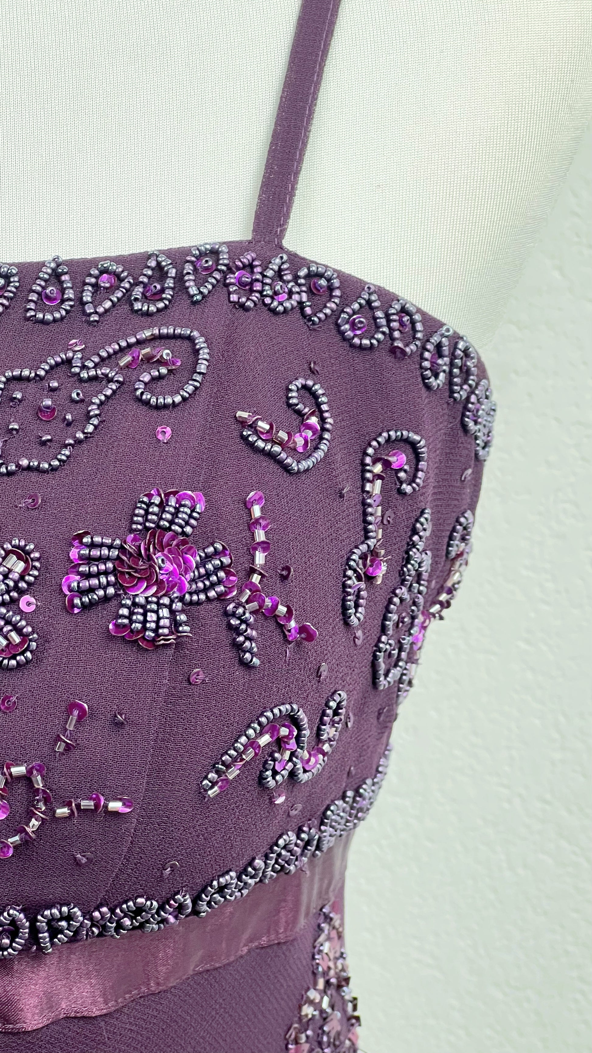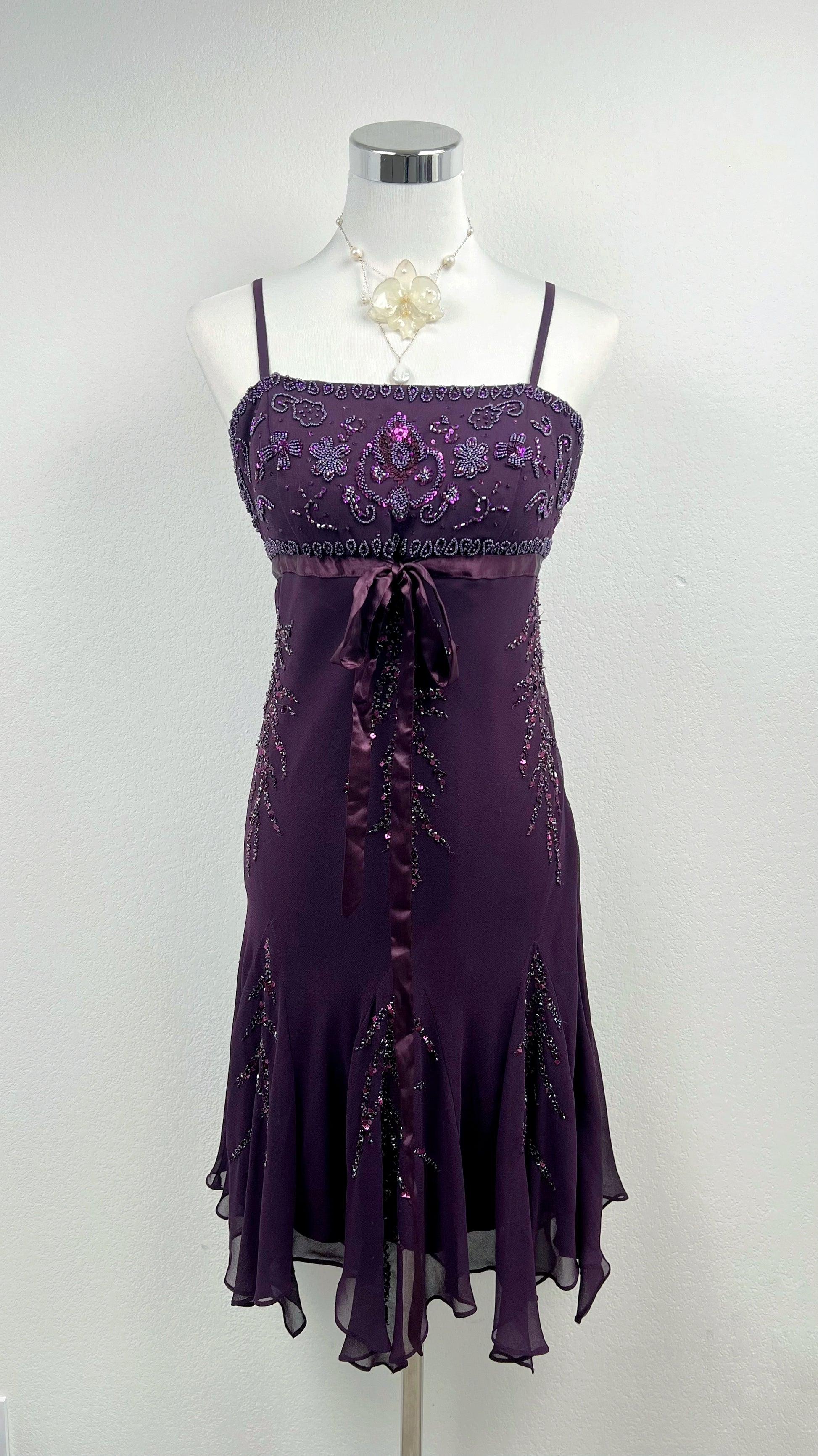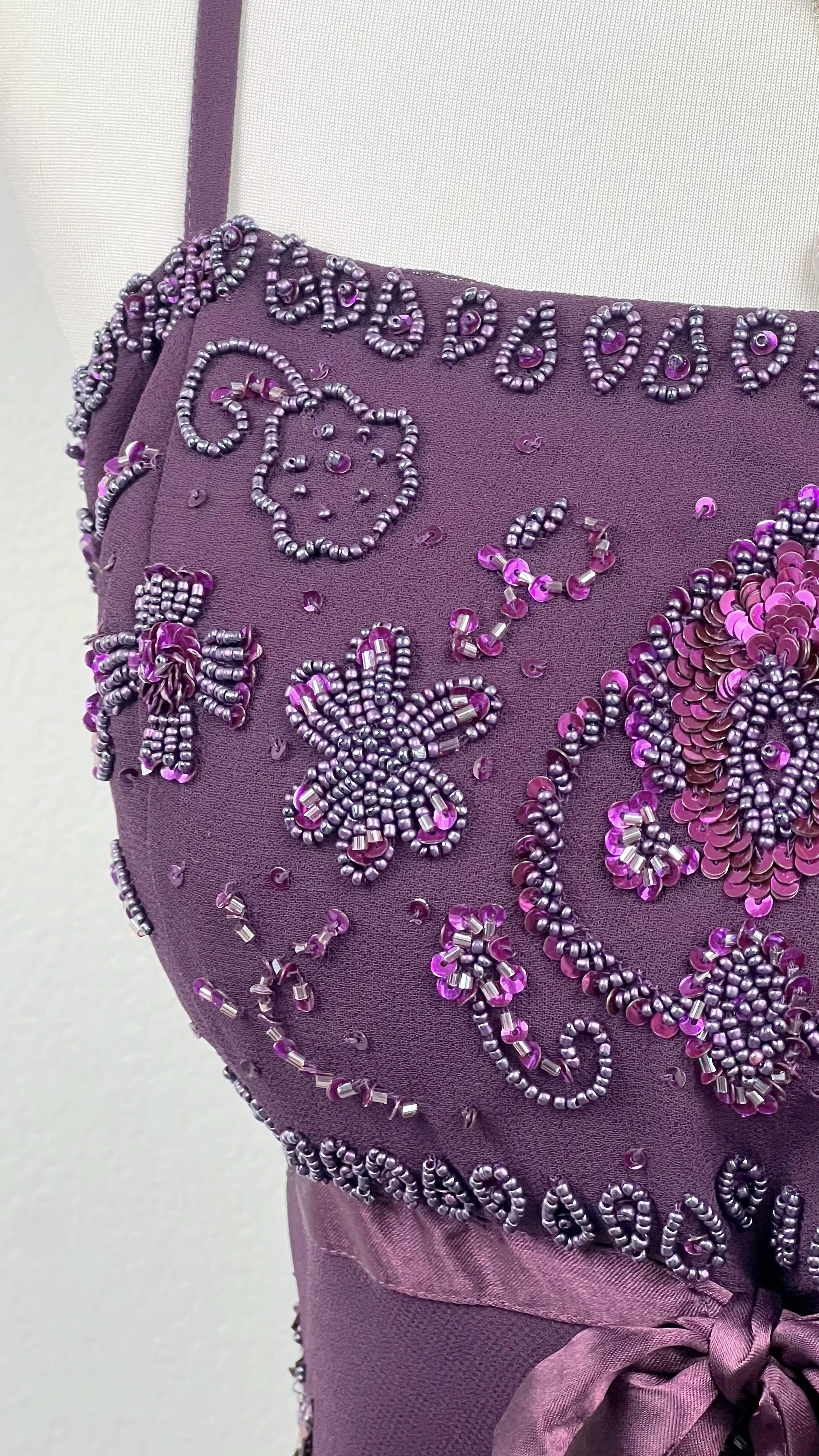 Rendered in a deep plum-purple chiffon, this piece is intricately adorned with shimmering beadwork that traces celestial and floral motifs across the bodice and skirt. The square neckline feels structured yet soft, framed by delicate straps, while the satin ribbon at the waist adds a subtle corset-inspired touch.