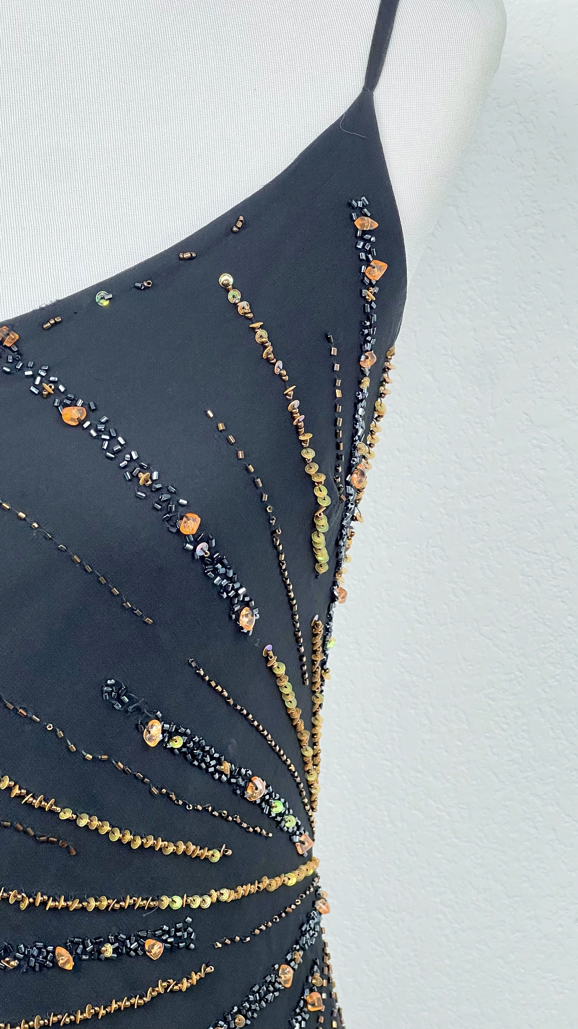 La Midnight Starlight Dress est une création féerique en 100% soie, brodée à la main de perles scintillantes formant un motif solaire captivant.