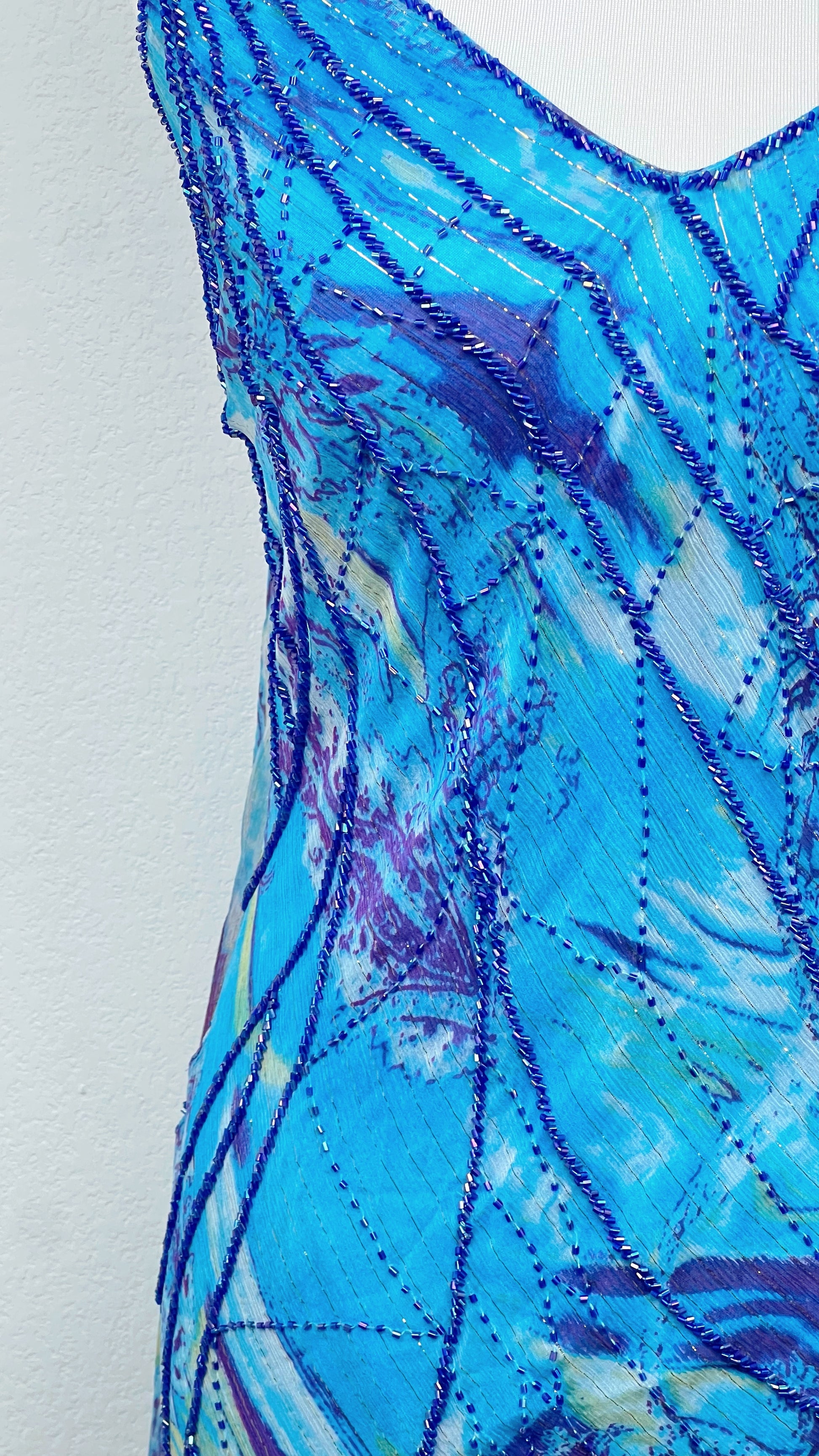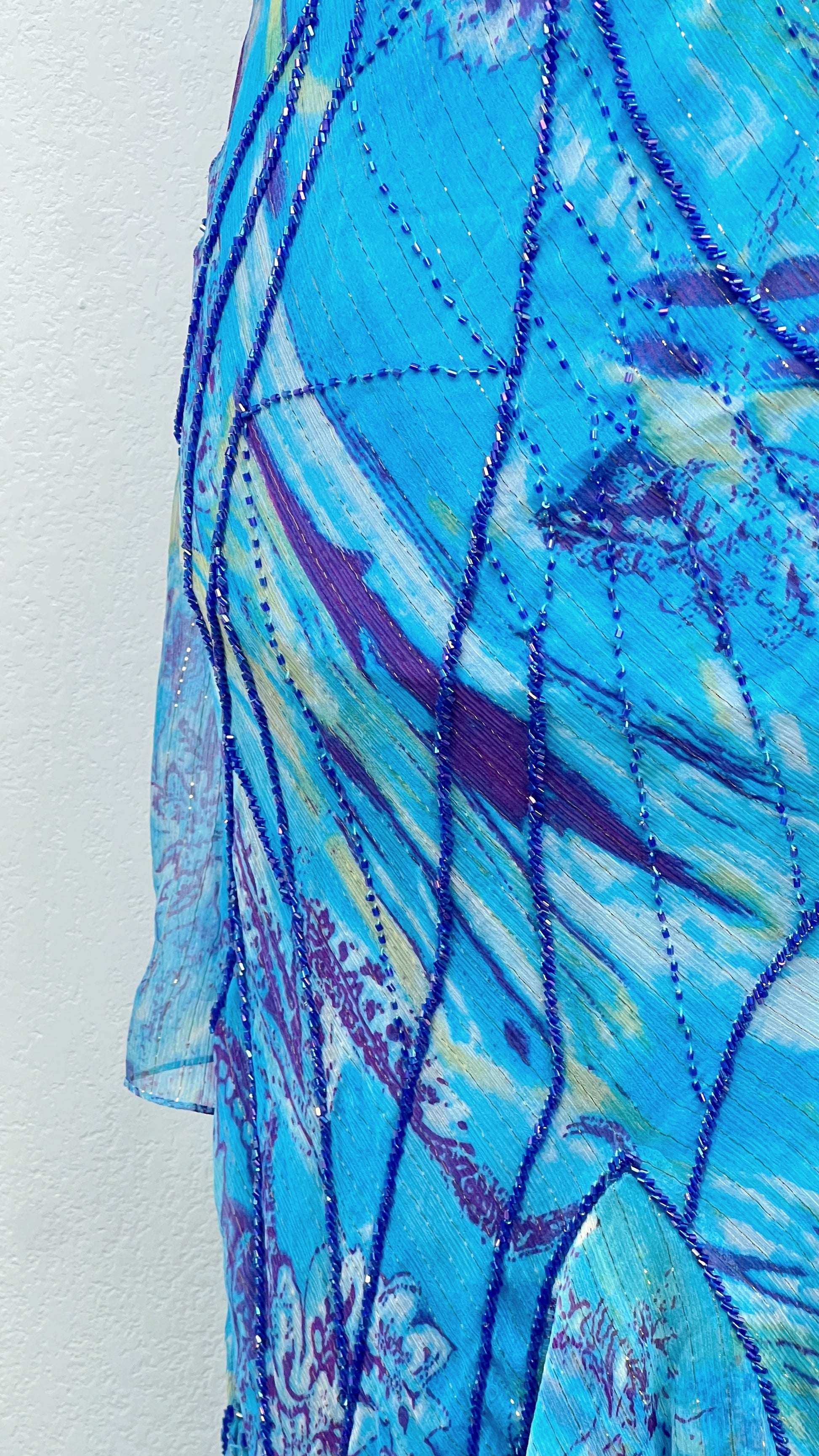 Son imprimé bleu océan mêlé de touches violettes rappelle les vagues, les reflets d’eau et les mondes marins enchantés.