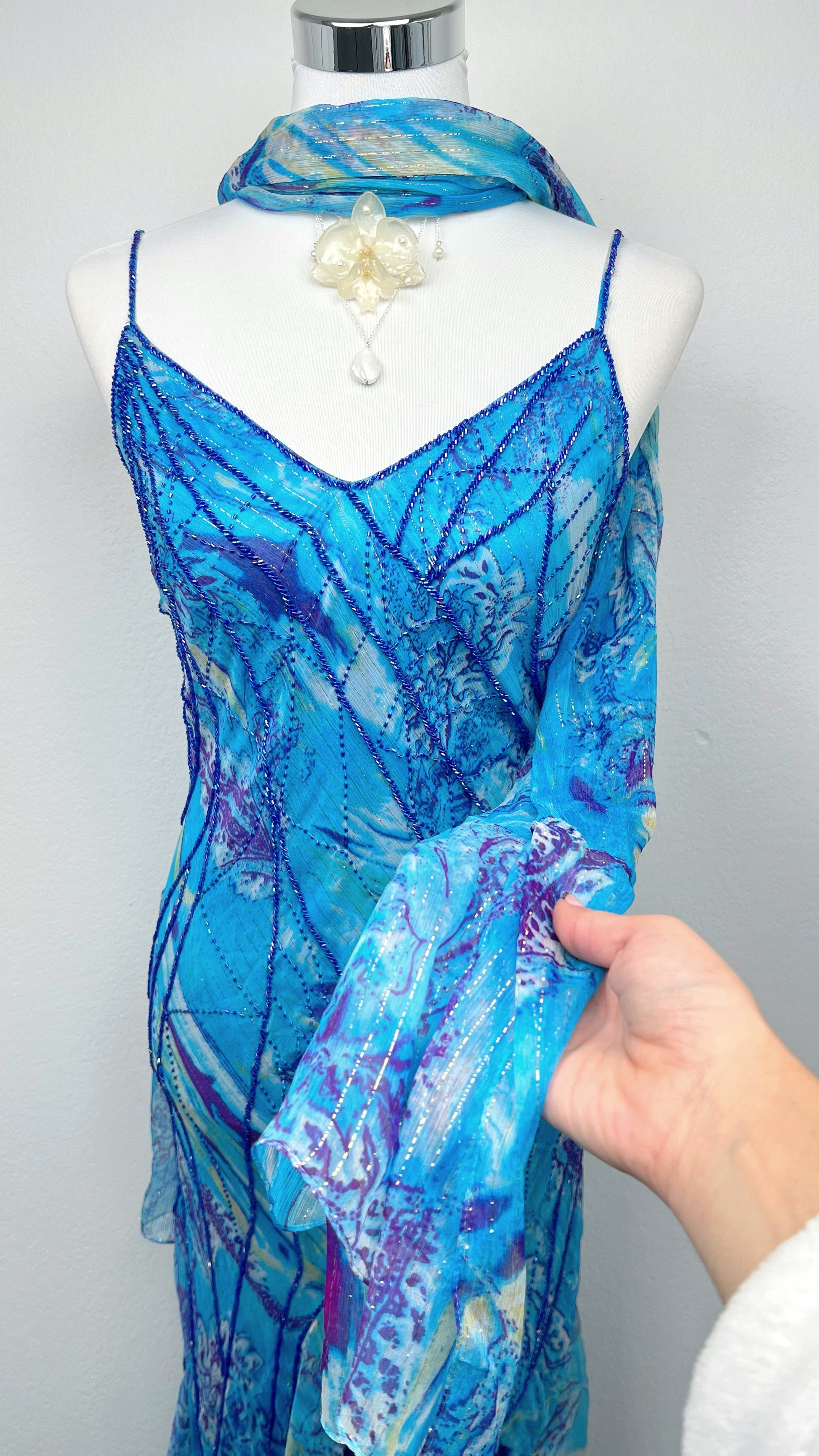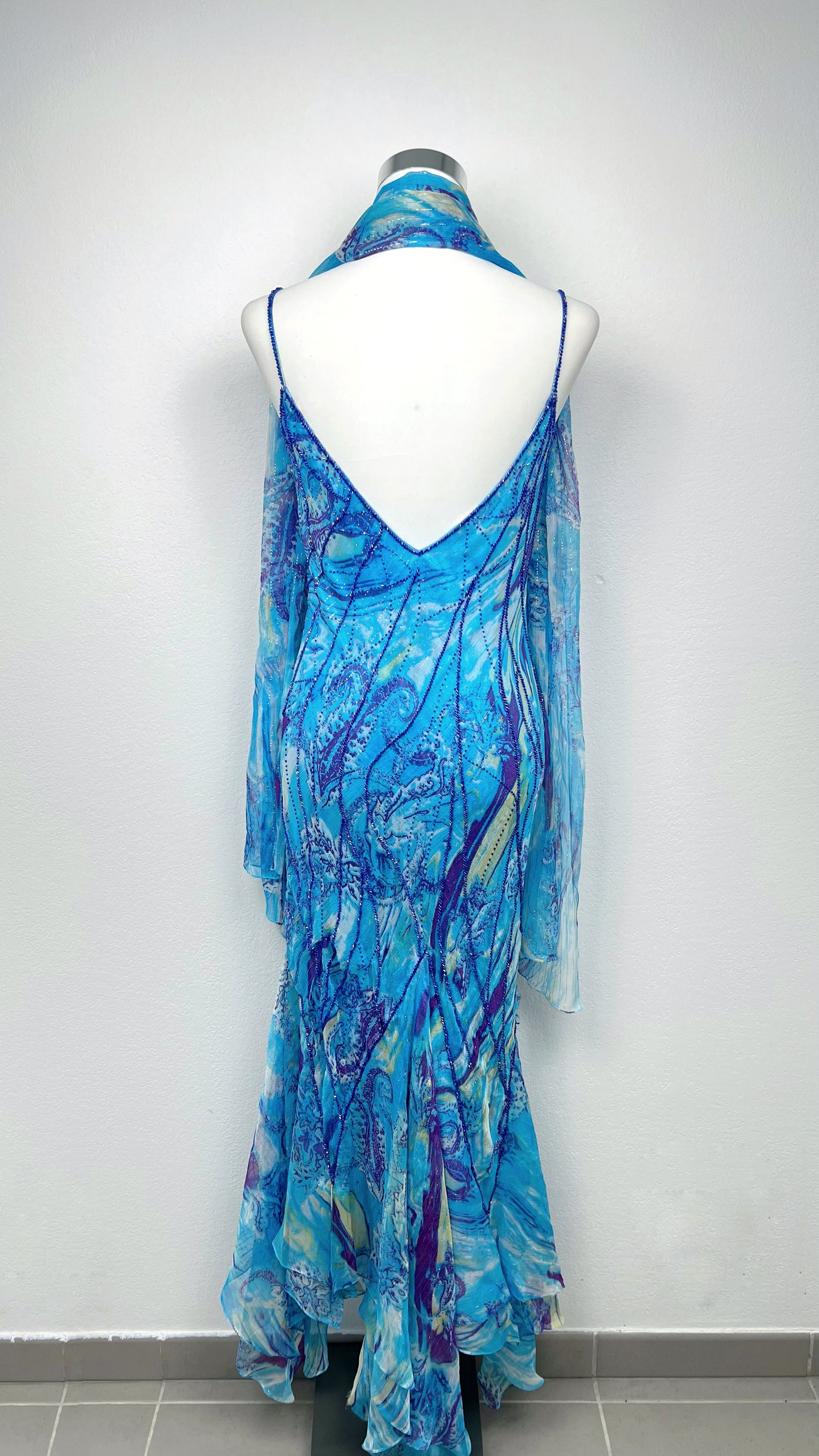 Une robe féerique d’exception, réalisée en 100% soie, accompagnée de son châle assorti pour une allure encore plus magique.