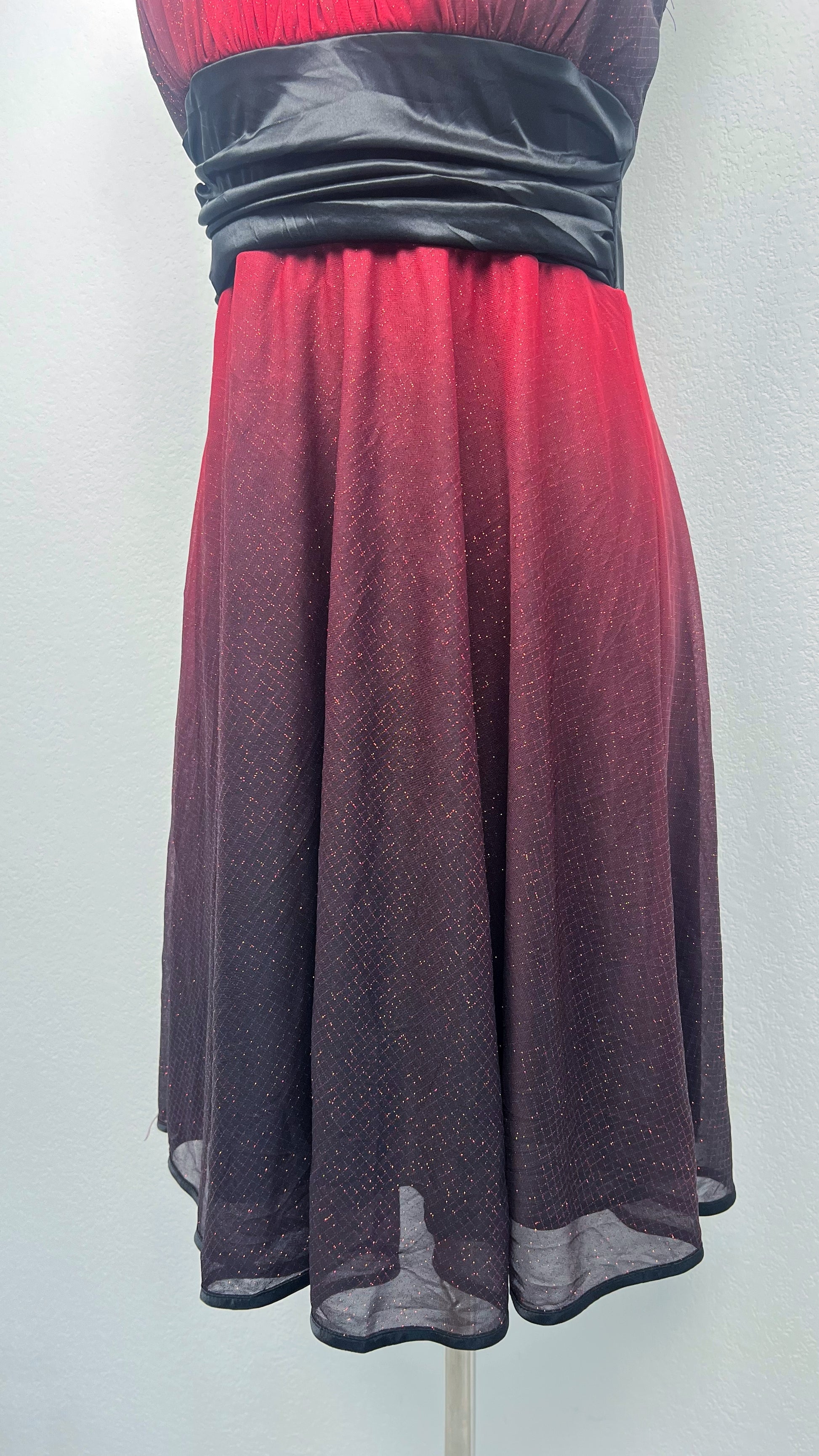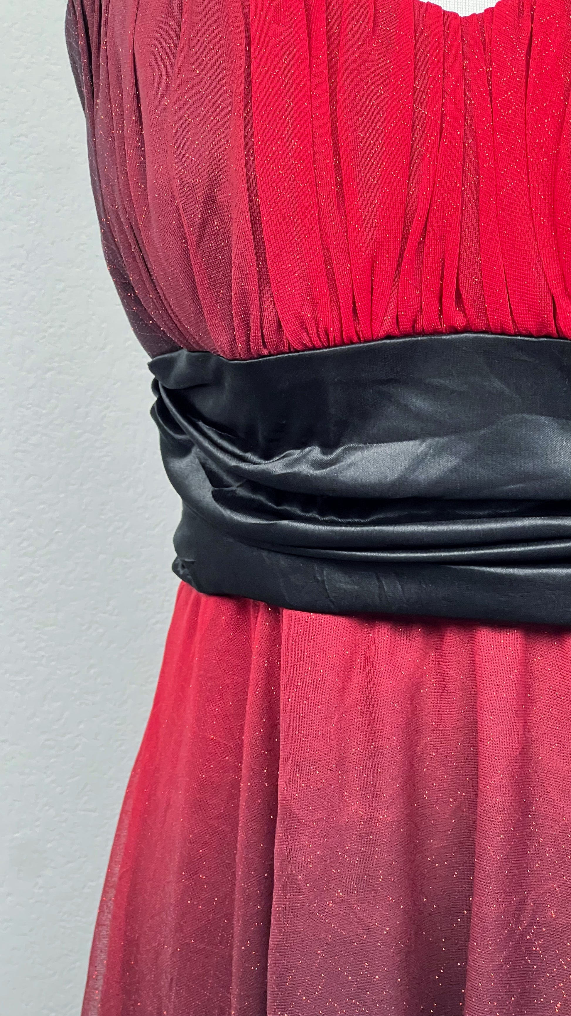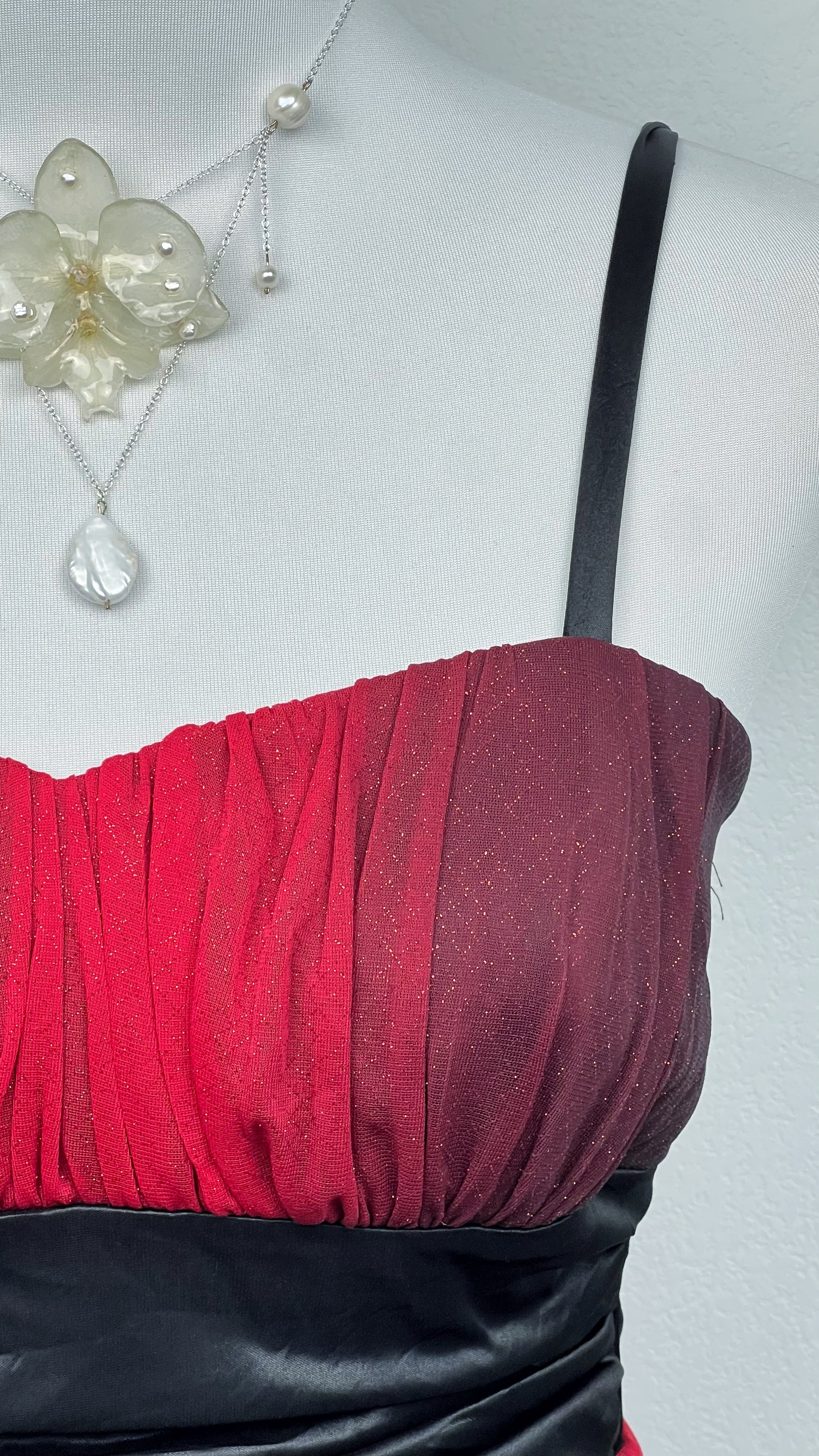 Sublime robe dégradée du rouge profond au bordeaux, parsemée de fines paillettes qui captent la lumière à chaque mouvement.