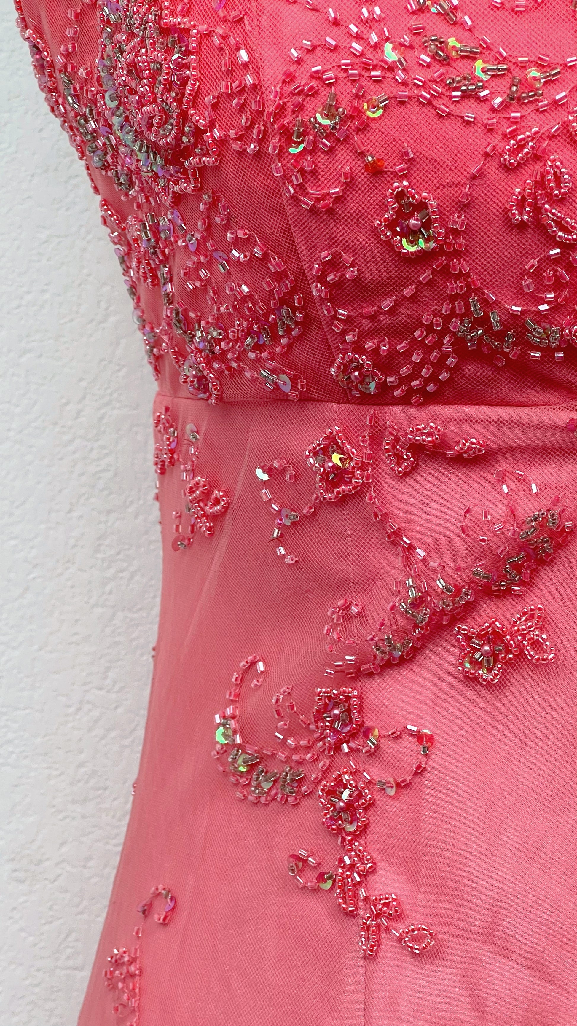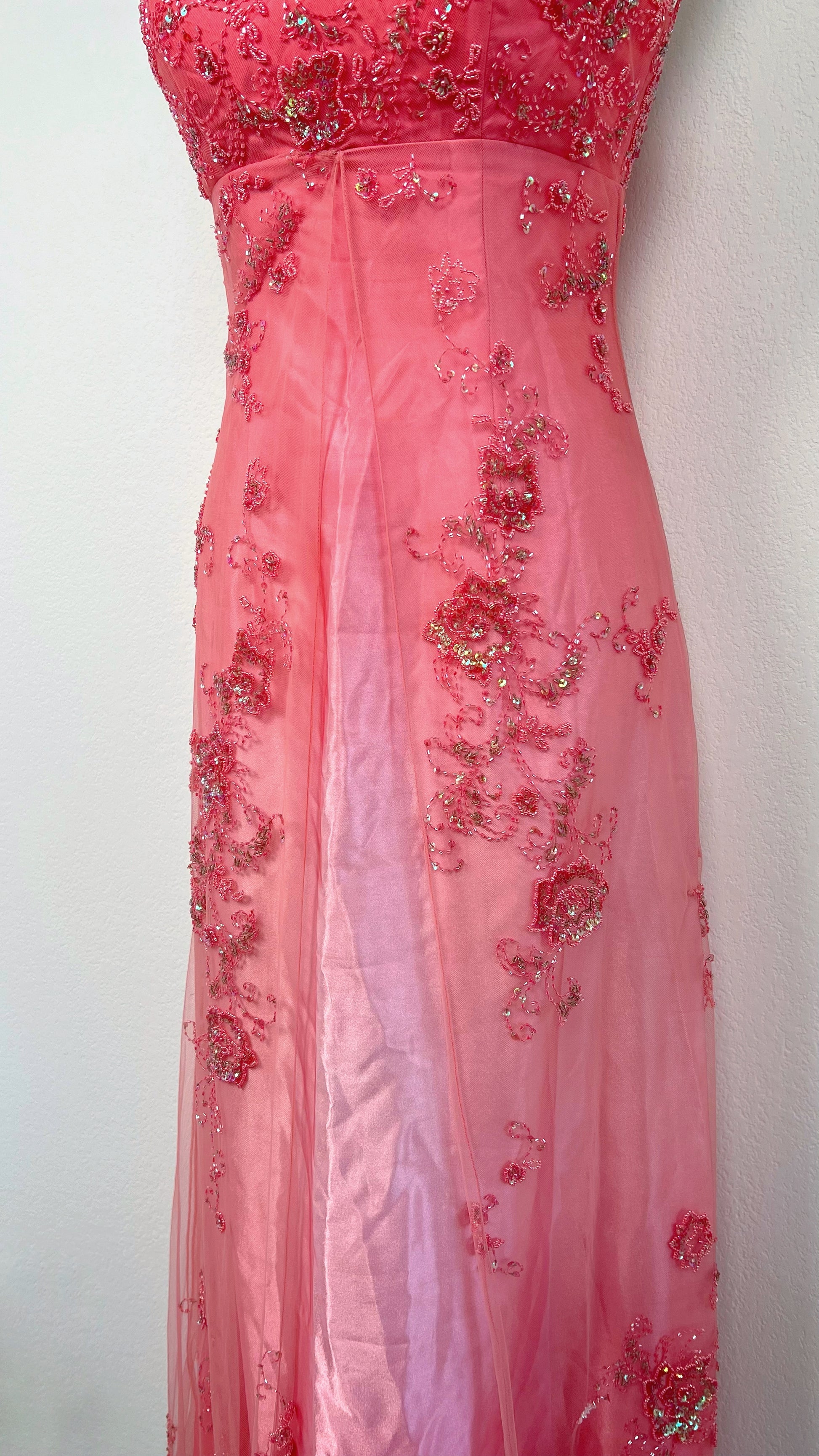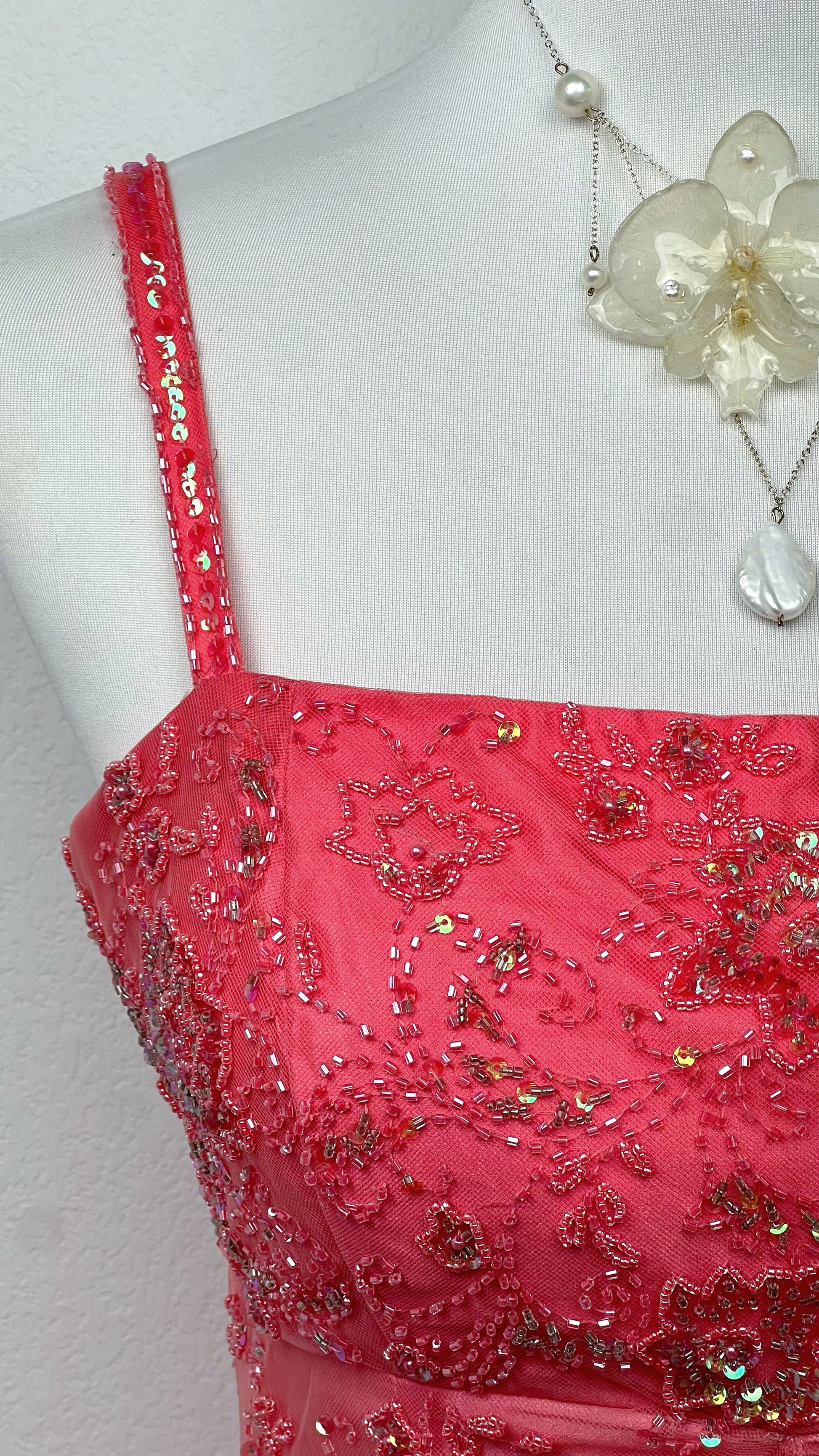 Sa coupe longue et fluide épouse la silhouette avec douceur, tandis que les fines bretelles et le buste structuré rappellent l’élégance des robes de bal féeriques. Chaque détail brodé capte la lumière et crée un effet précieux, presque magique.