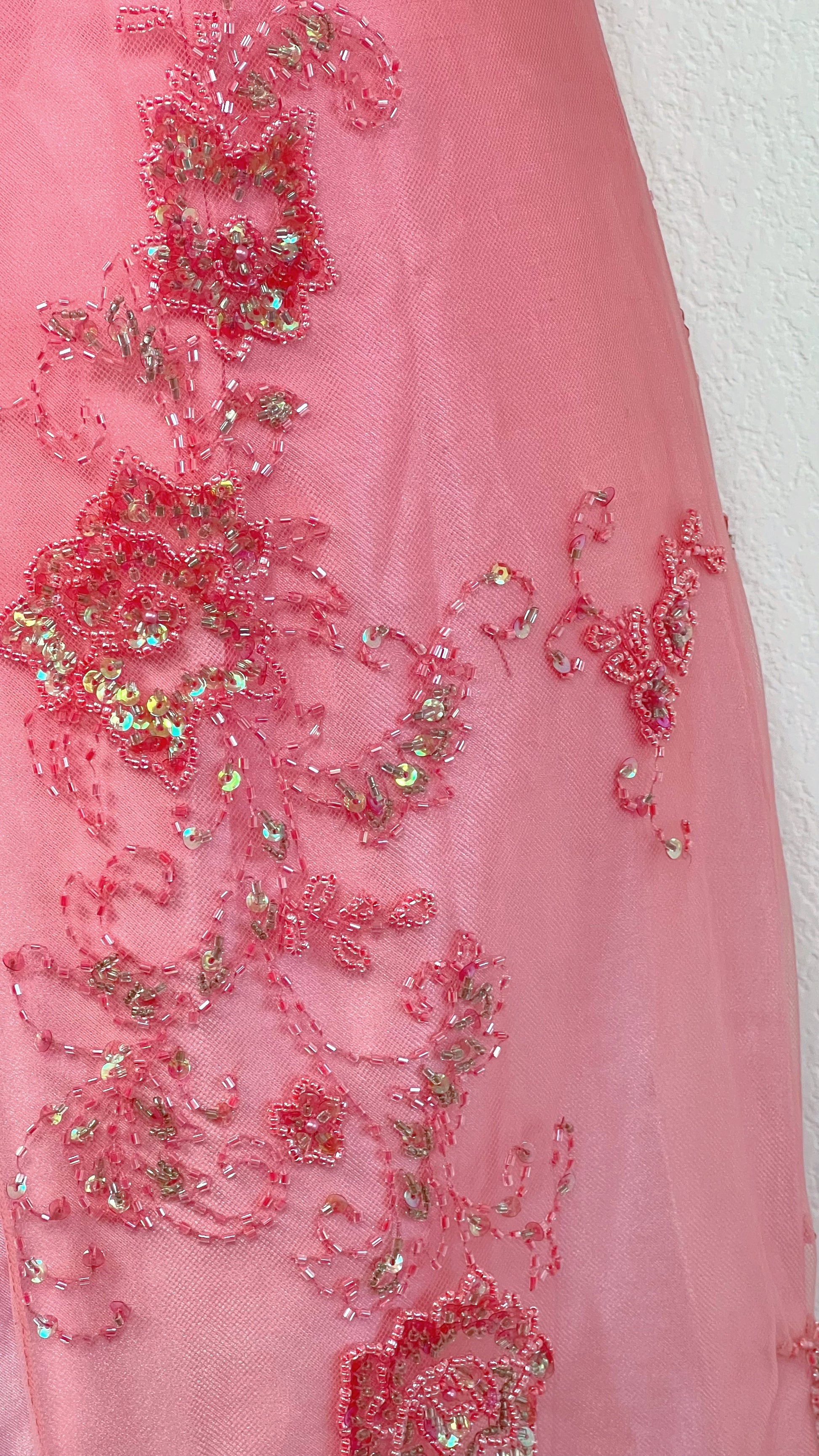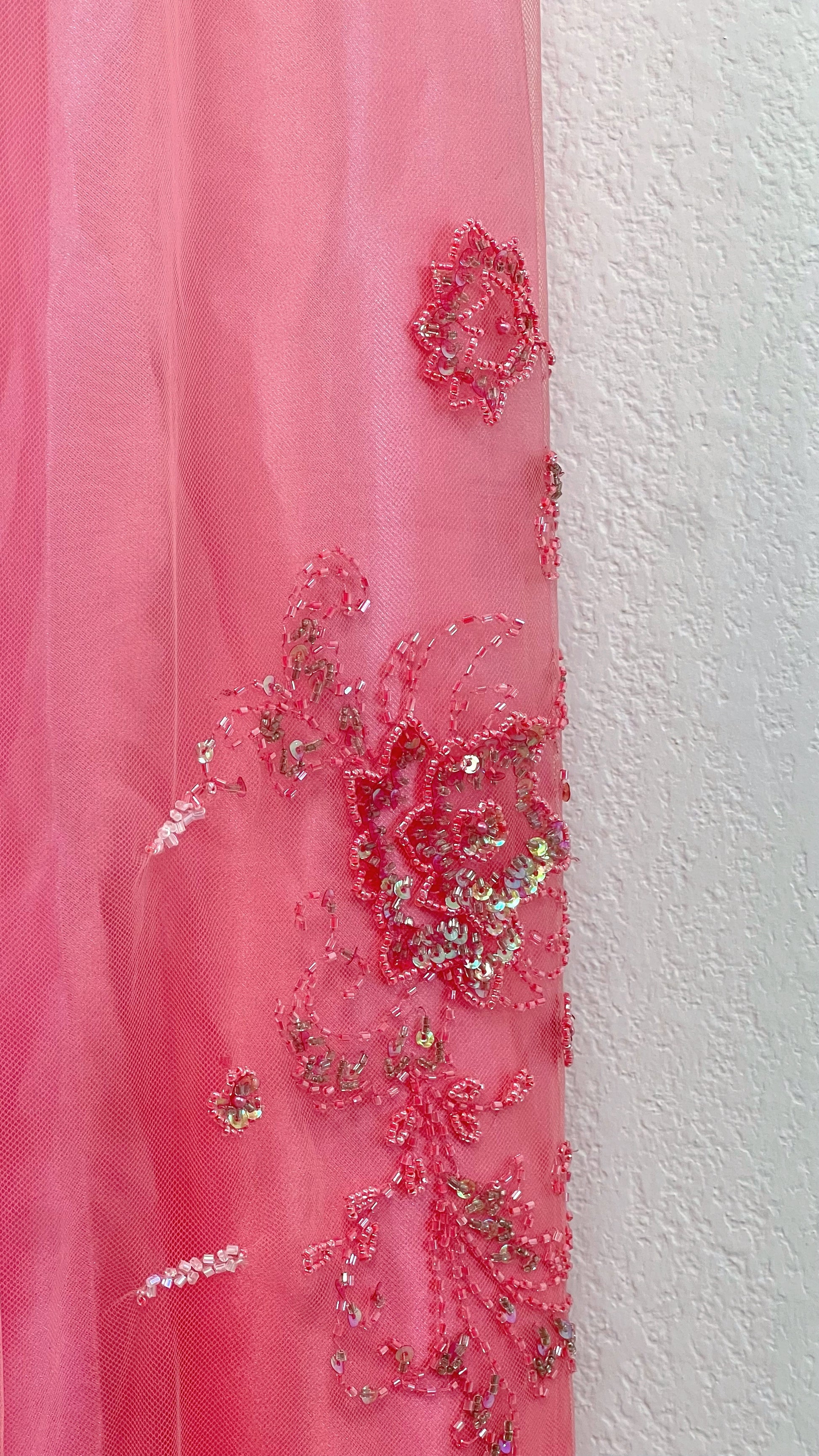 Robe de princesse d’une rare délicatesse, sublimée par un voile rose poudré entièrement brodé de perles scintillantes.