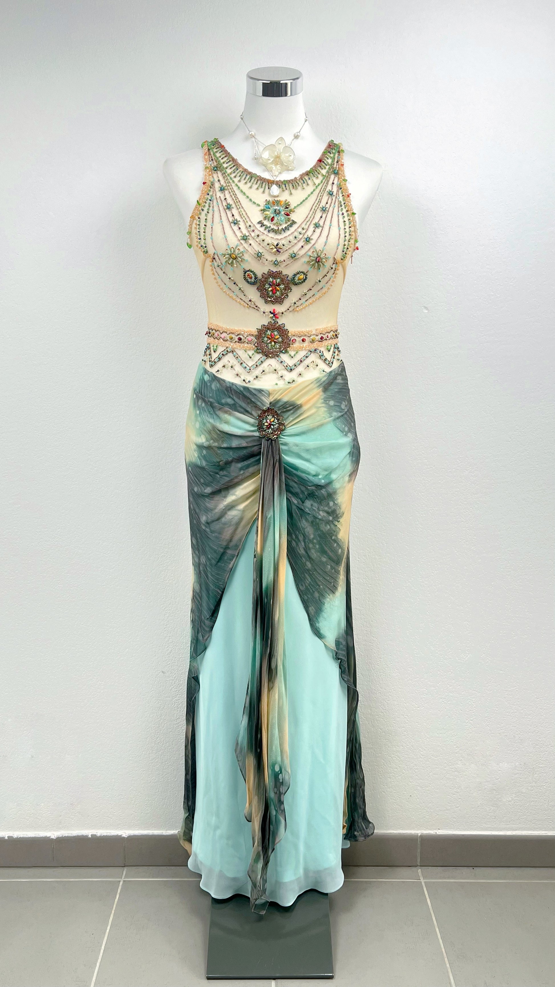 The Sea Empress Sirena Gown is an extraordinary fully beaded silk masterpiece — fluid, regal, and hypnotic.