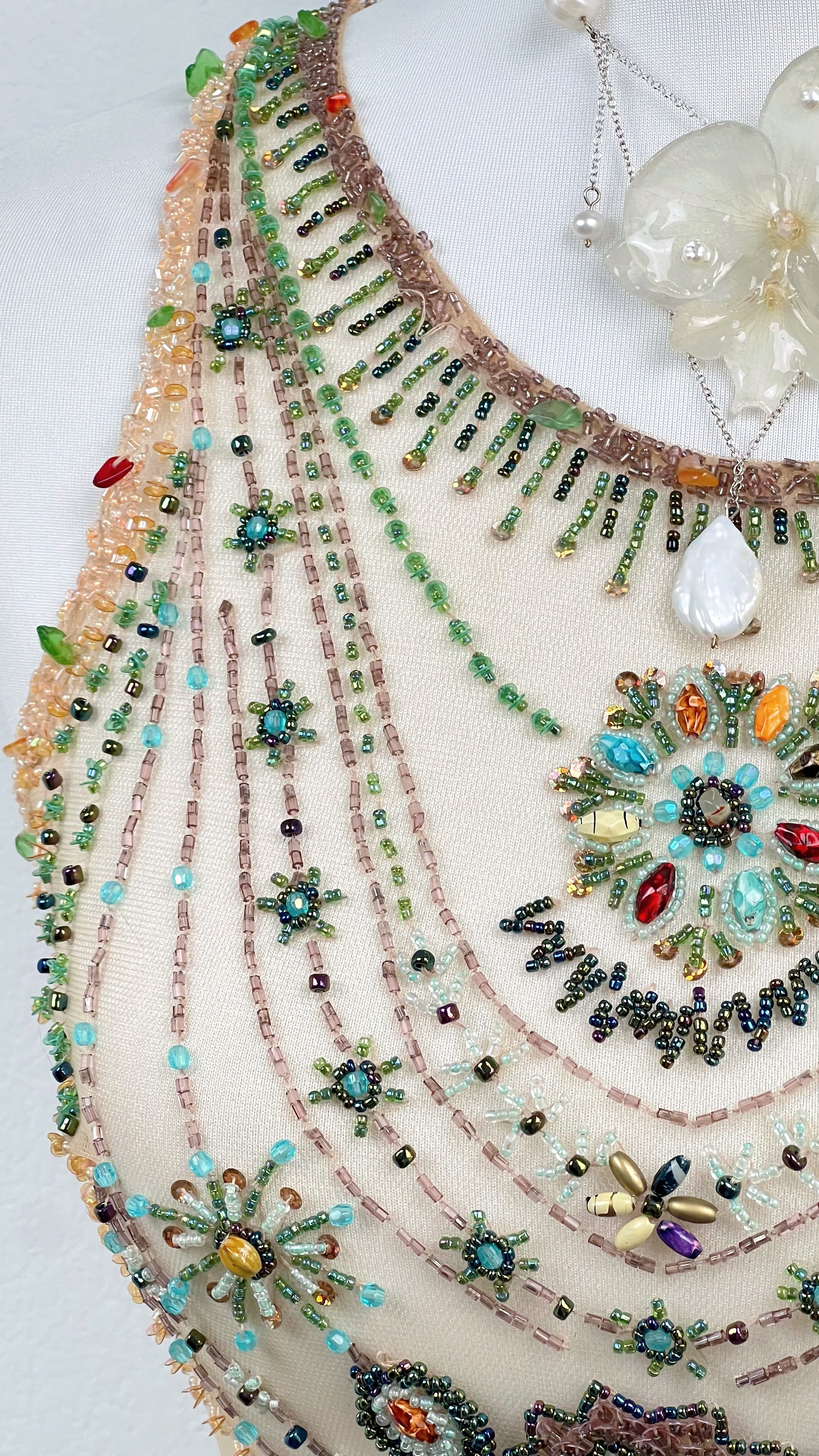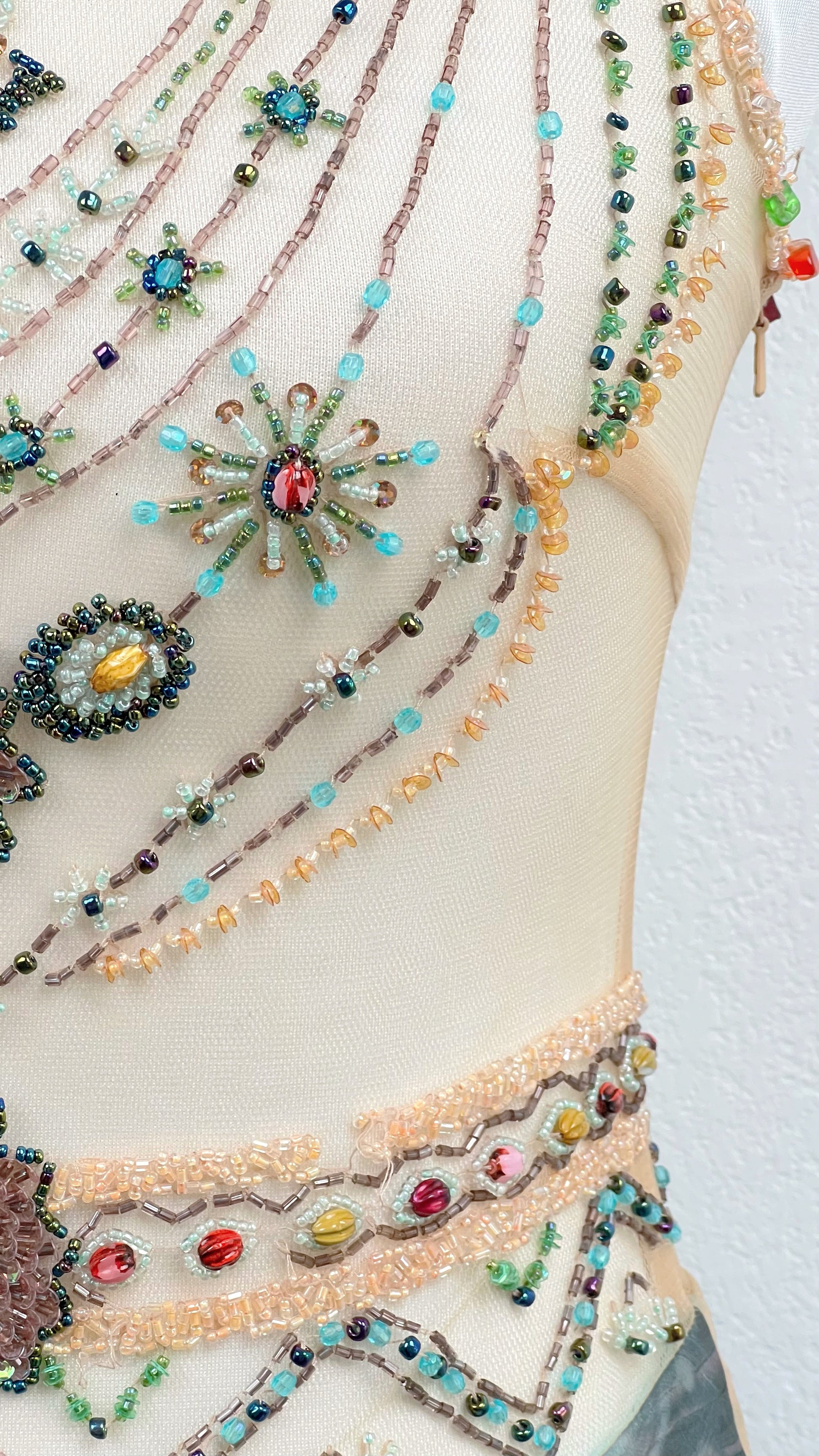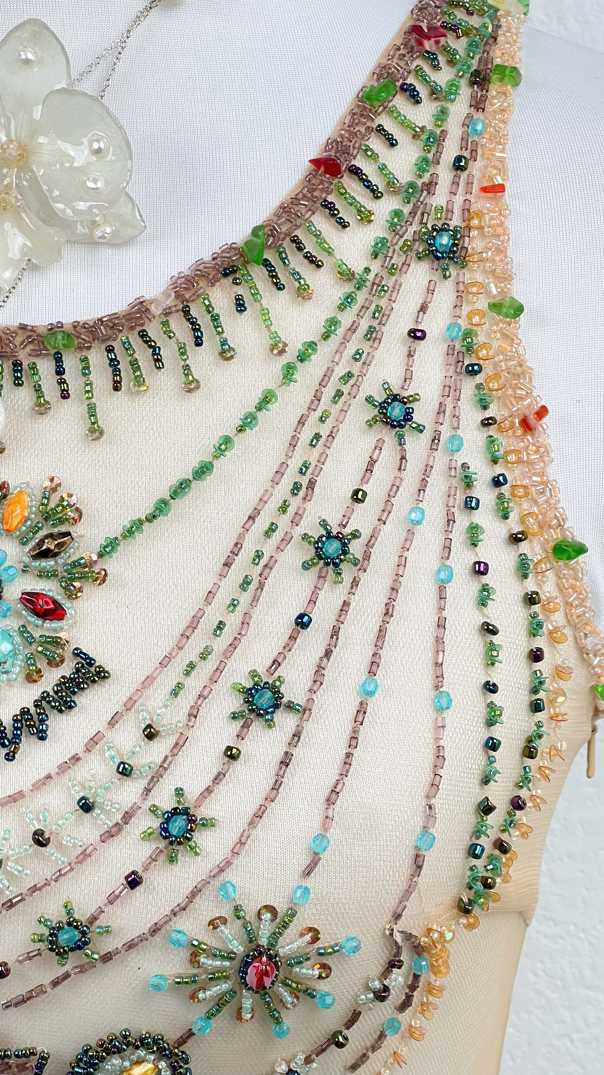 The bodice is adorned with intricate, hand-applied beadwork arranged like cascading jeweled necklaces across the neckline. Multicolored crystals and ornate medallion details shimmer against the soft neutral silk base, creating the illusion of sunken treasure resting on skin.
