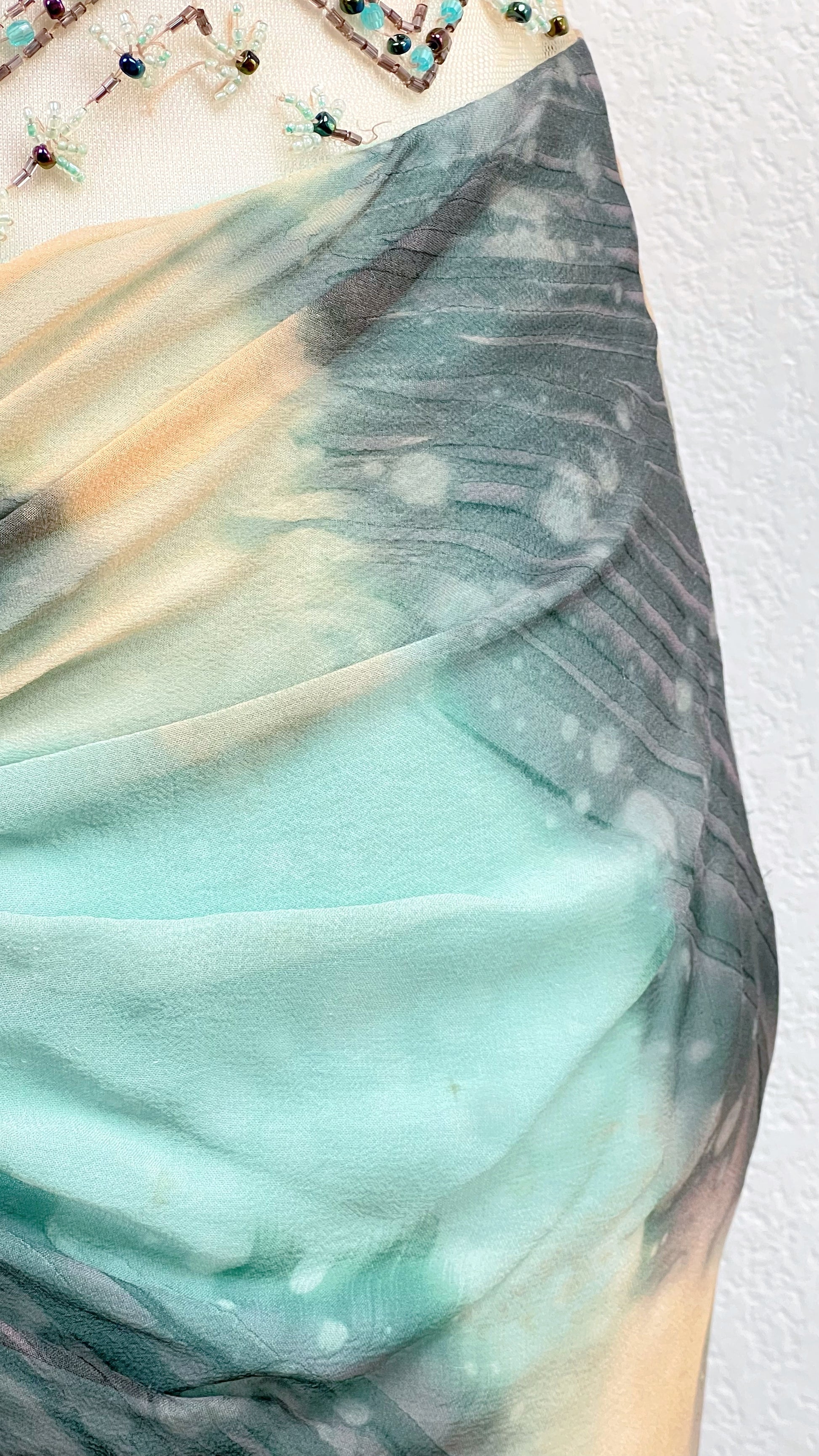 The waist is defined with a richly embellished belt motif, leading into a draped silk skirt in oceanic hues — seafoam, deep teal, misty jade, and soft sand tones melting into one another like tides at sunset. The front drape gathers into a jeweled centerpiece before flowing into a layered mermaid silhouette that moves like water.