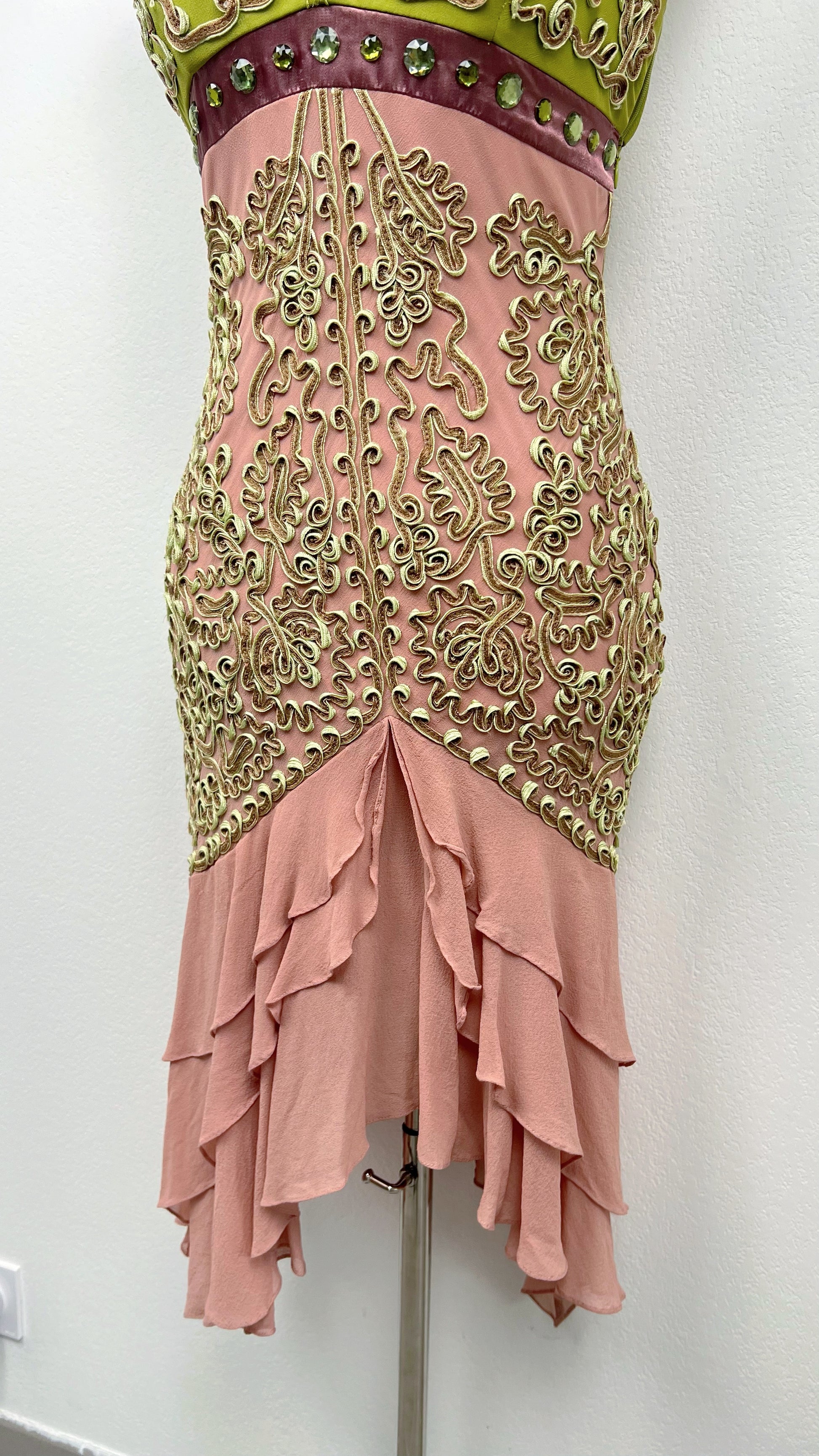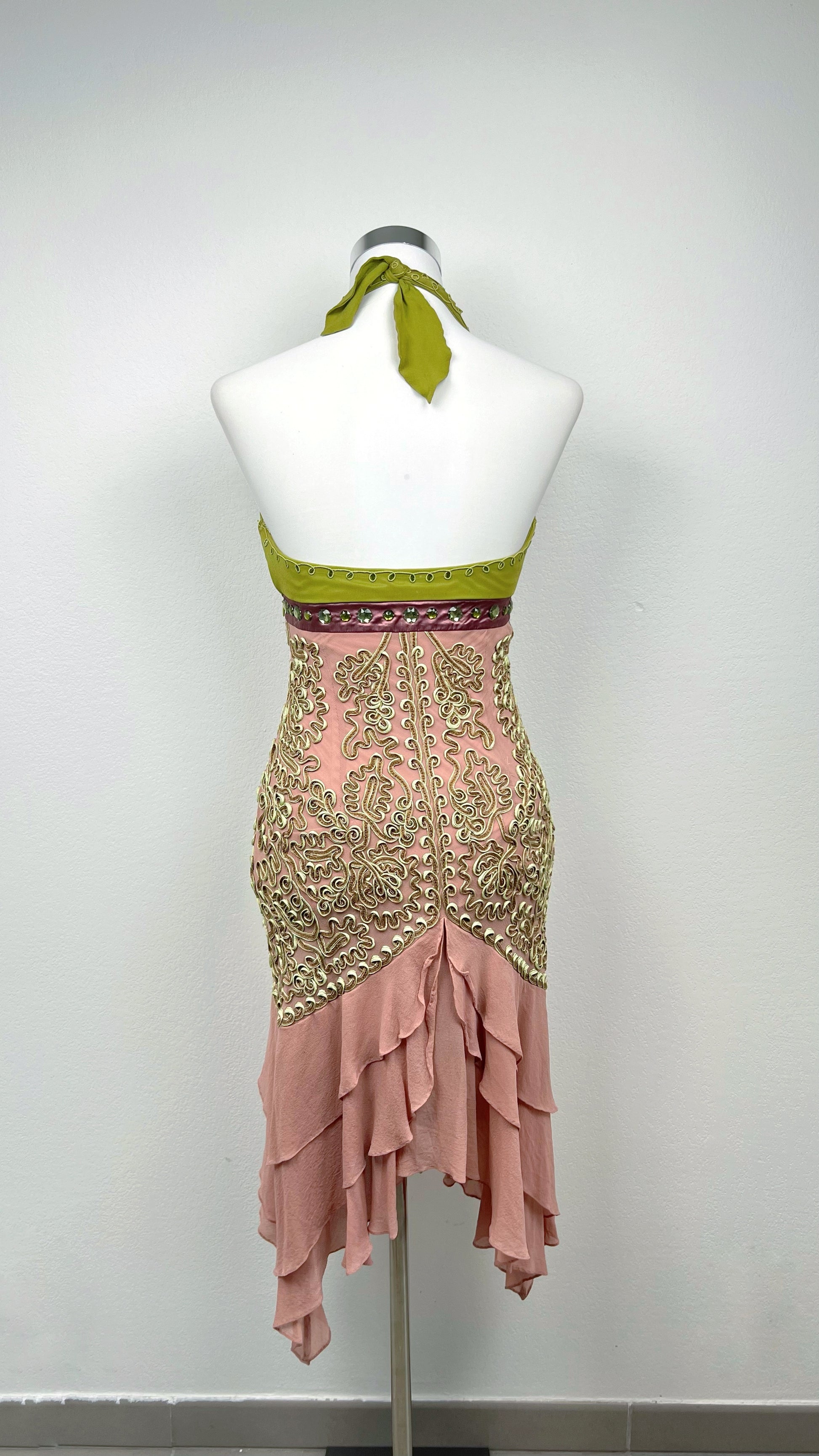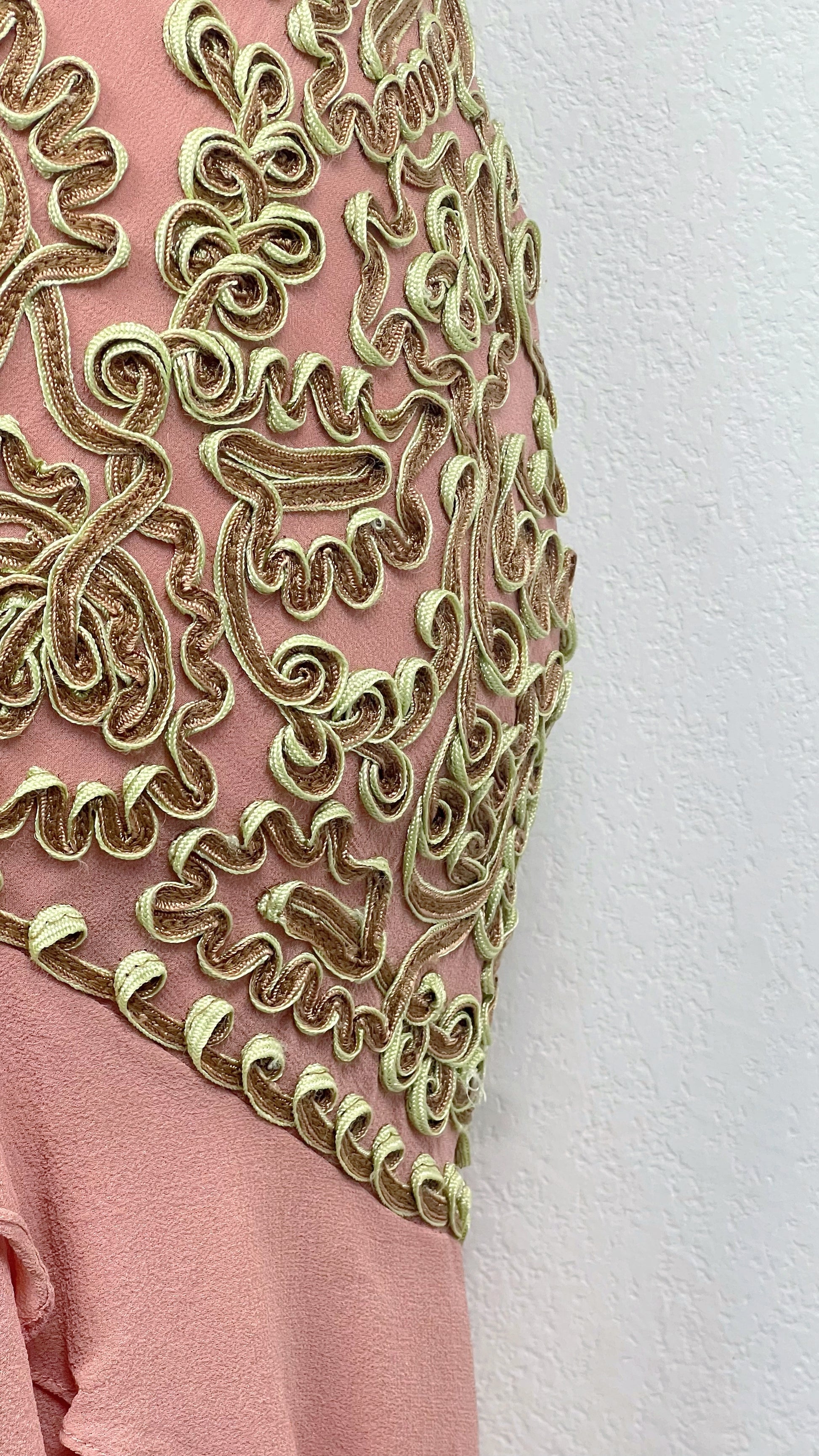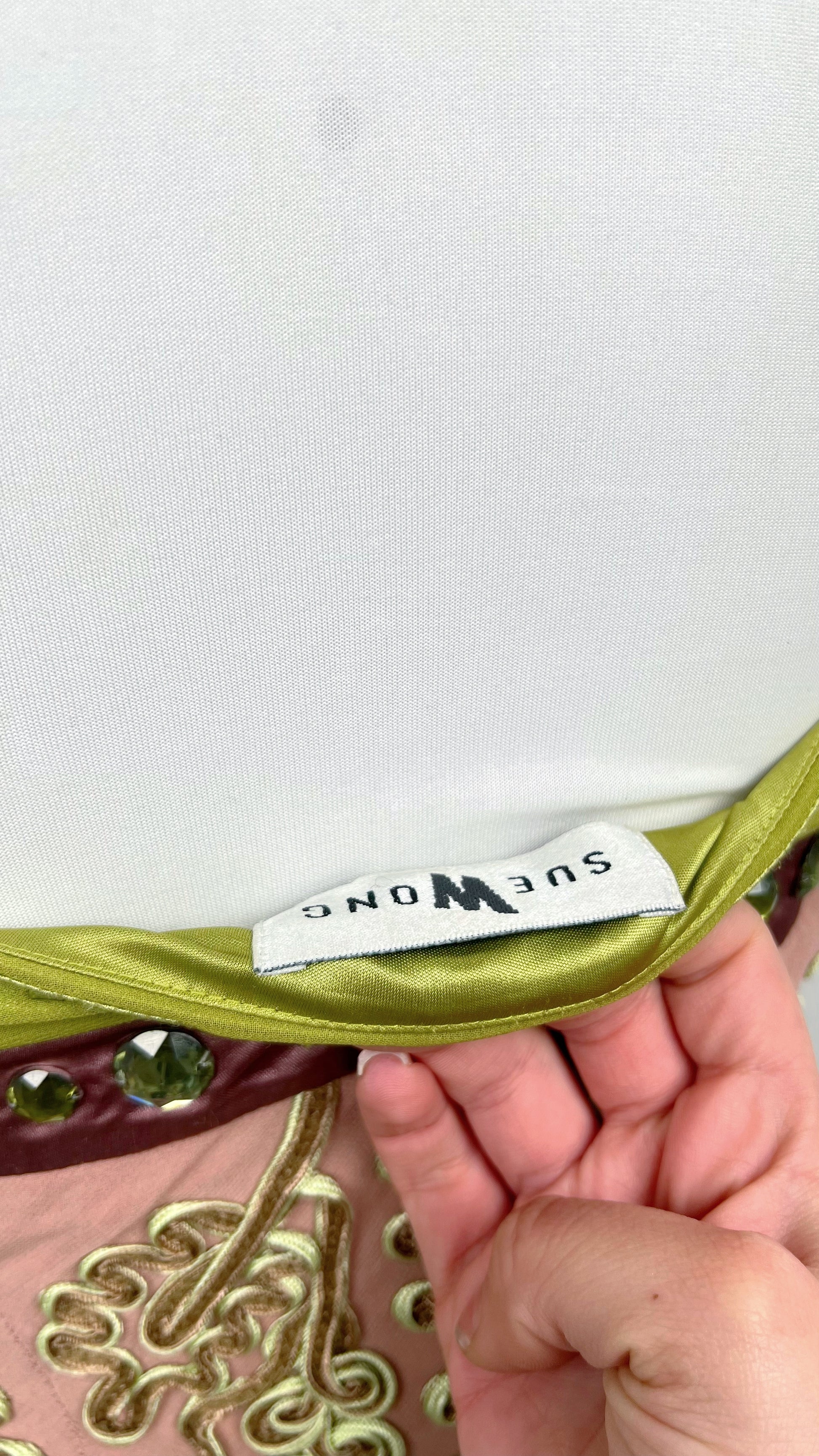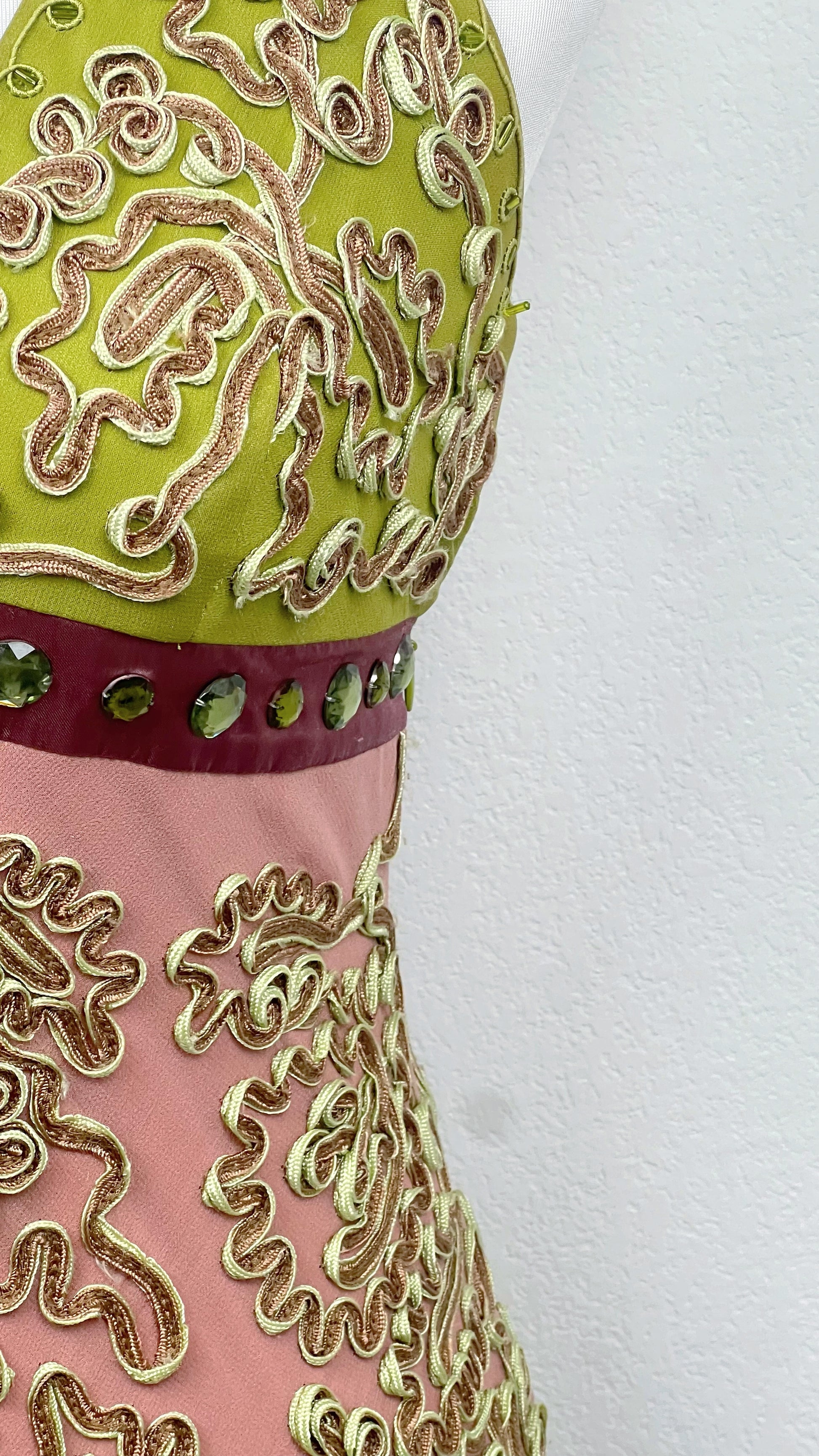 This rare Sue Wong creation blends fresh moss green with soft antique rose, wrapped in opulent golden embroidery that feels lifted from an enchanted palace. The halter neckline frames the silhouette with regal elegance, while the layered chiffon skirt falls like petals in slow motion.