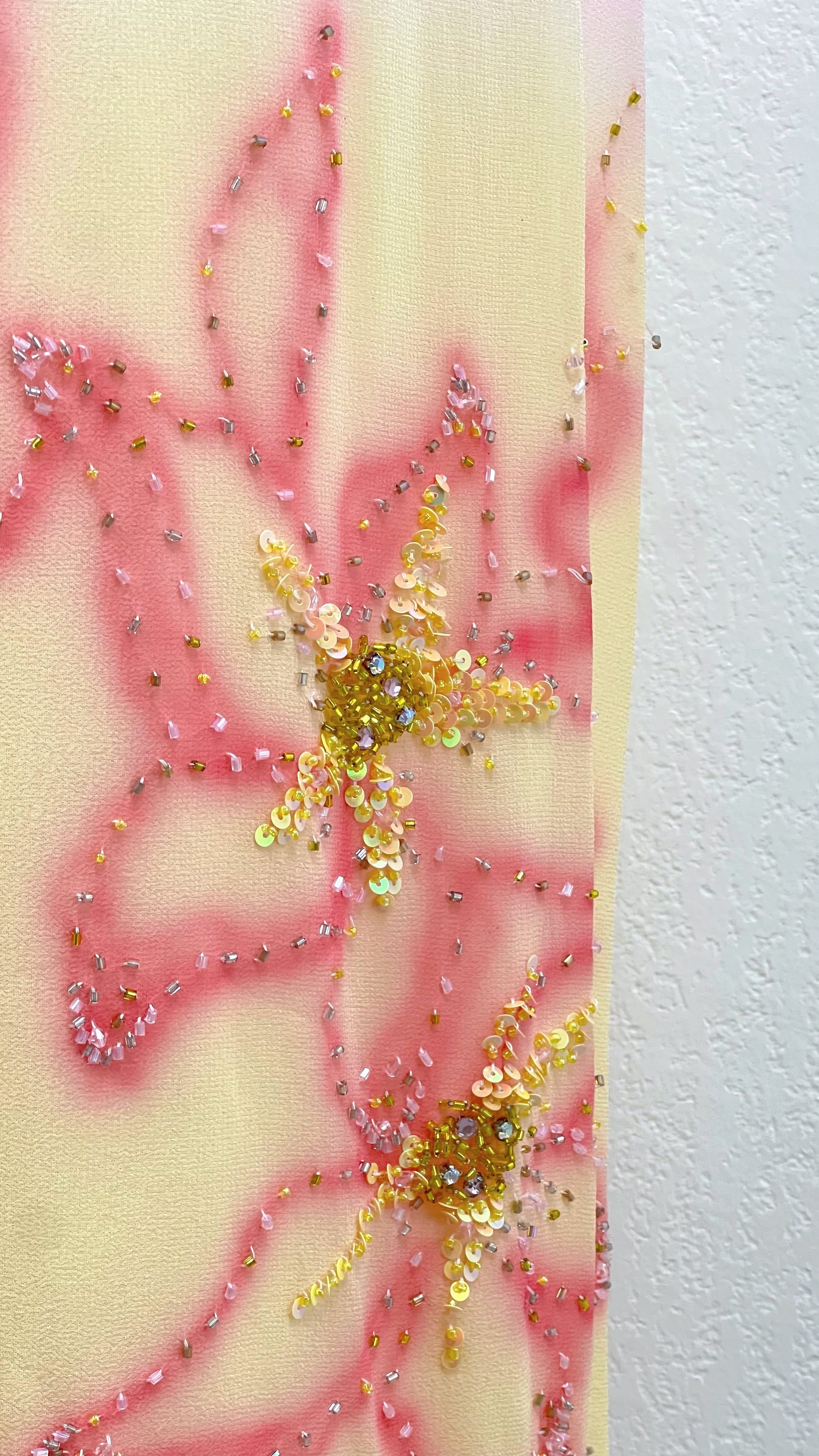 • Hand-beaded floral hem
