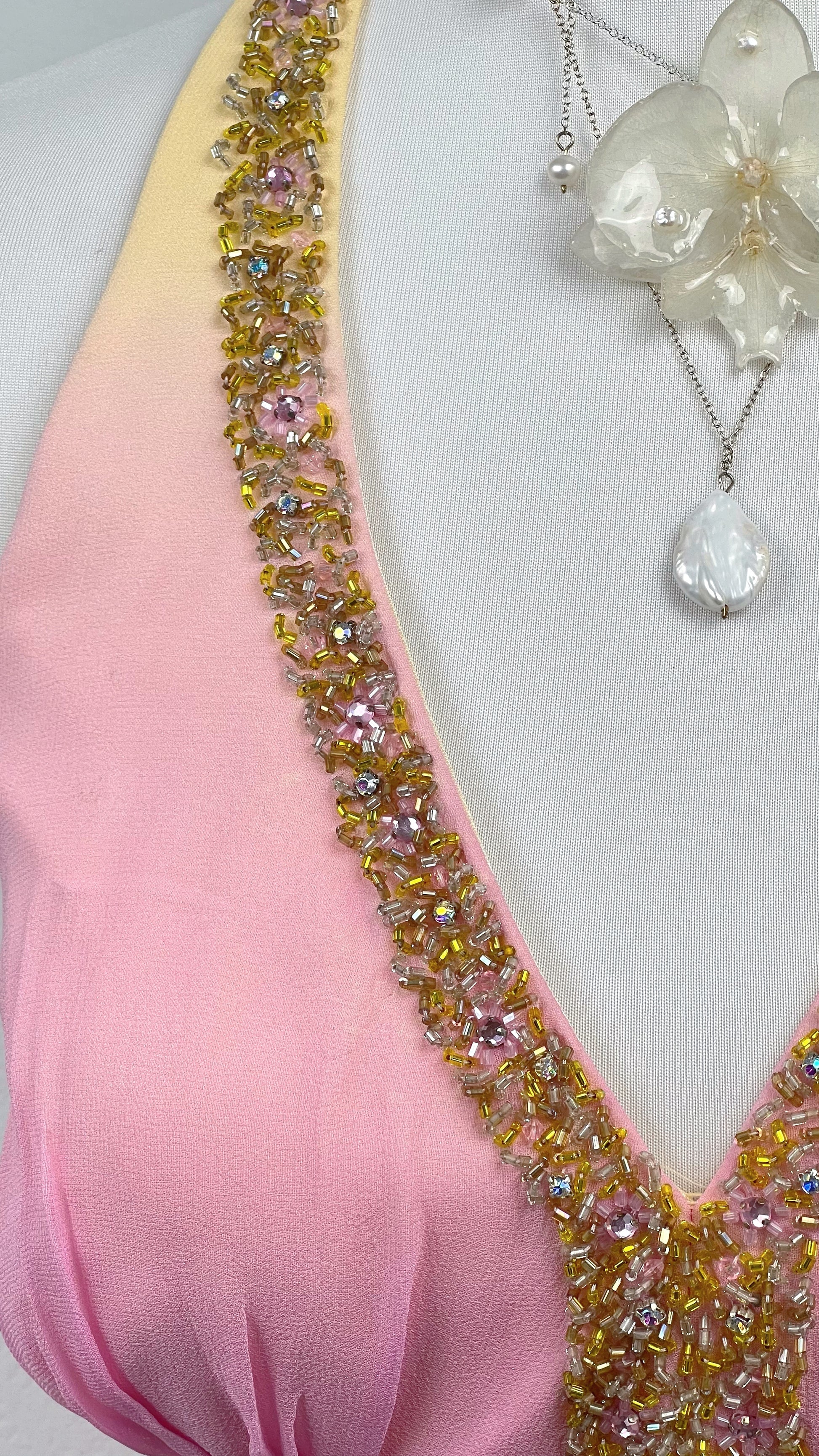 Crafted in fluid silk, the gown melts from blush pink into warm butter yellow, creating a delicate sunset ombré effect. The plunging halter neckline is richly embellished with golden beadwork that frames the décolletage like jewelry, leading to a sculpted empire waist adorned with a sparkling central medallion.