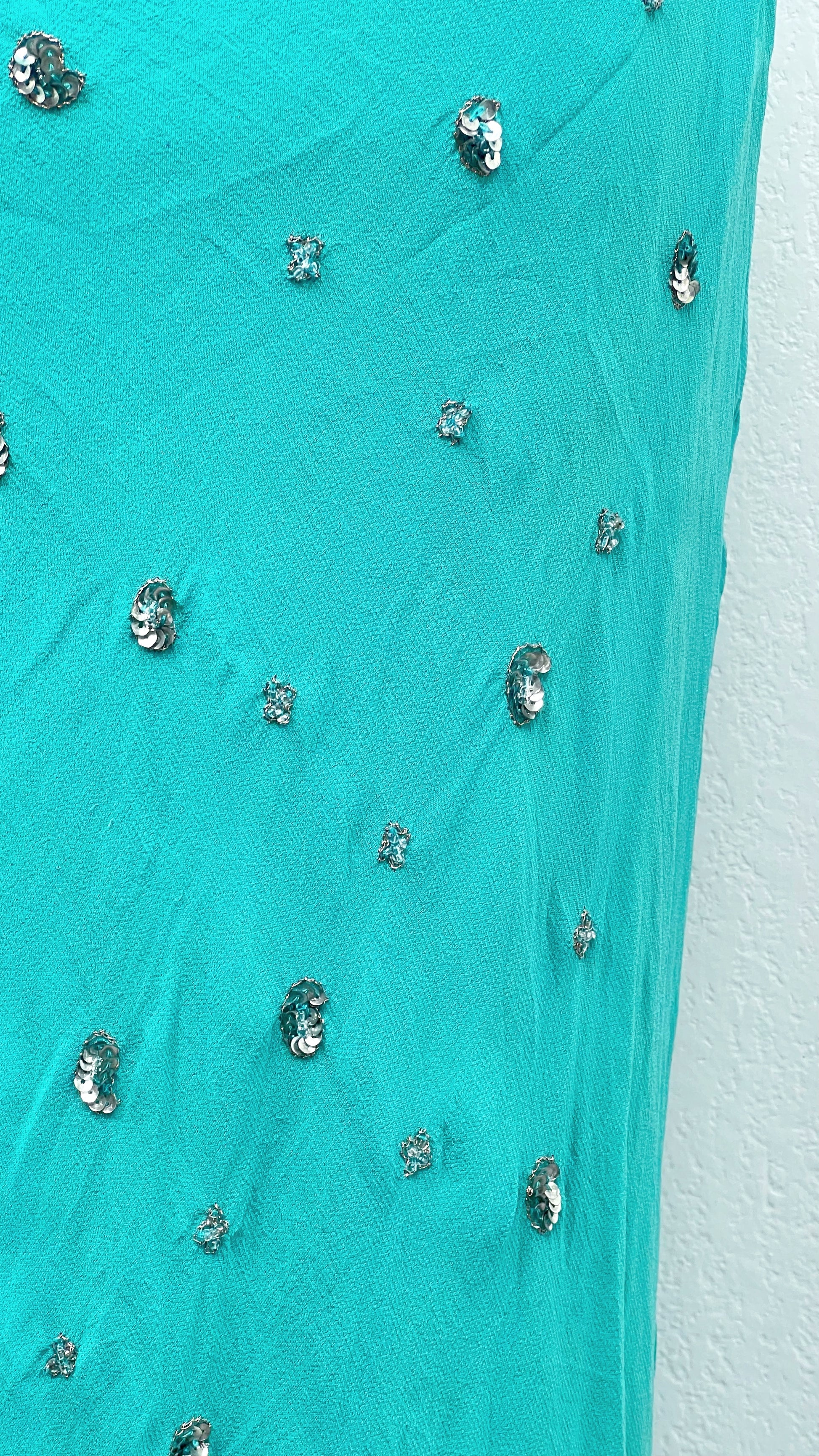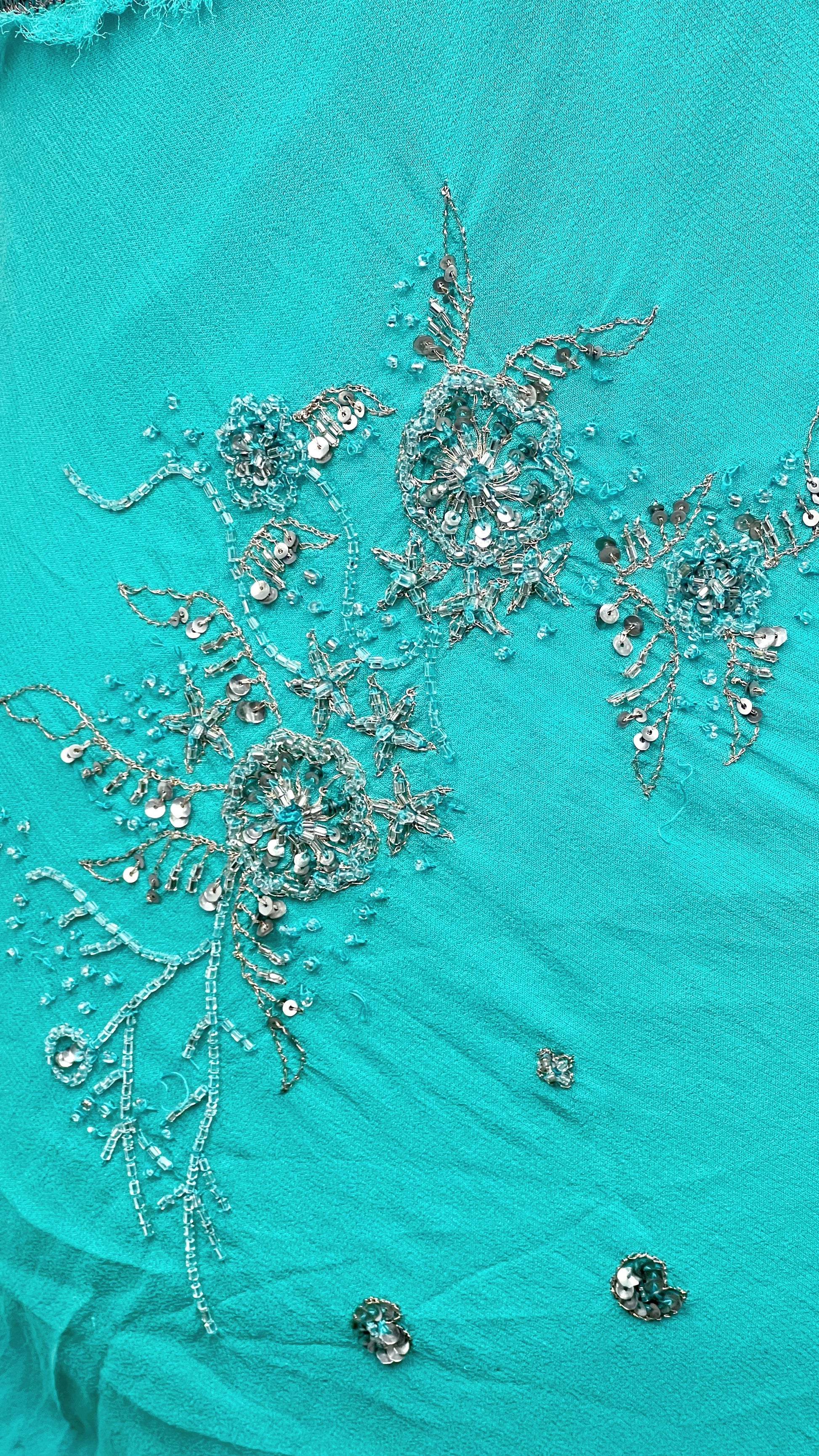 Une robe digne d’une sirène moderne, entièrement perlée à la main et sublimée par un turquoise lumineux qui capte la lumière comme l’eau au soleil.